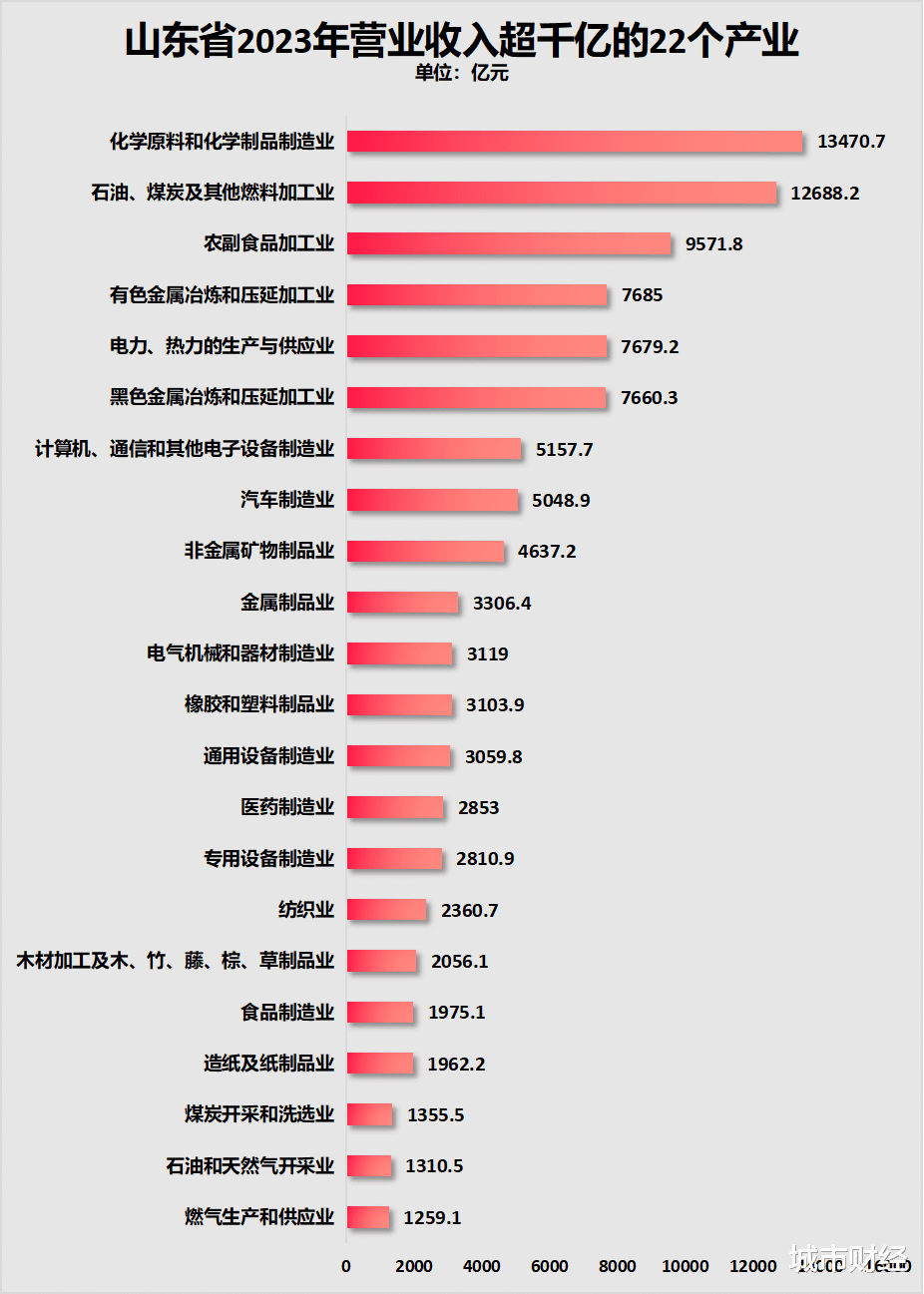 山东省营收规模最高的是化学原料和化学制品制造业,高达1.35万亿以上;其次是石油、煤炭加工类,有1.27万亿;排在第三的是农副食品加工业,营收9571.8亿元。然后便是黑色金属冶炼与有色金属冶炼两个产业,规模都在7000亿之上。