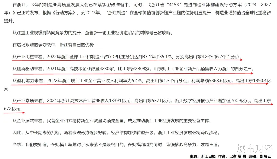 浙江省官方2023年发布过一份《2022年全部工业增加值再超山东,浙江连续两年居全国第三》,文中针对浙江与山东产业各项指标进行了对比: