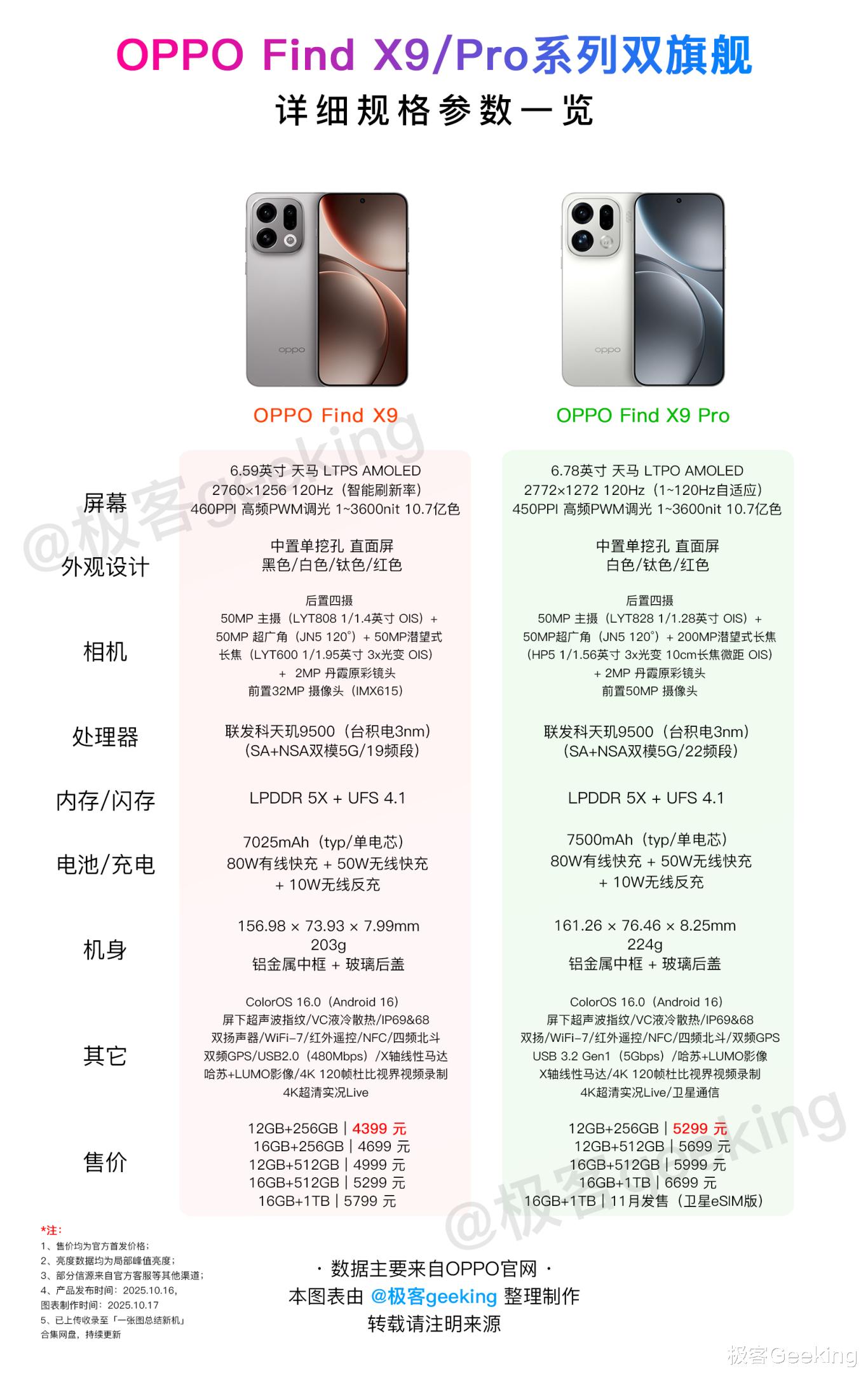 依然惯例,关于最近发布的 OPPO Find X9 系列,极客君这次依然带来了「一张图总结手机配置」,这两款新一代旗舰手机的外观、详细配置参数和售价尽在这张总结图表了,数据持续维护和更新。