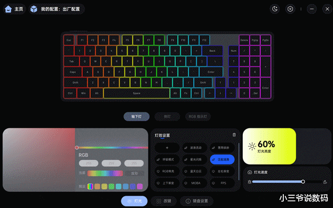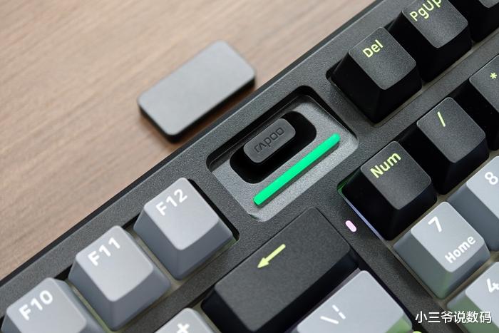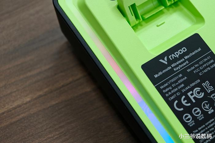 作为一款机械键盘,光效是必不可少的。雷柏V700DIY-98预设有12种幻彩RGB按键背光,同时支持8种自定义灯效调节,除了按键灯效外,还设计有氛围侧灯带,虽然角度比较向下,但是亮起之后的氛围感还是很强的。