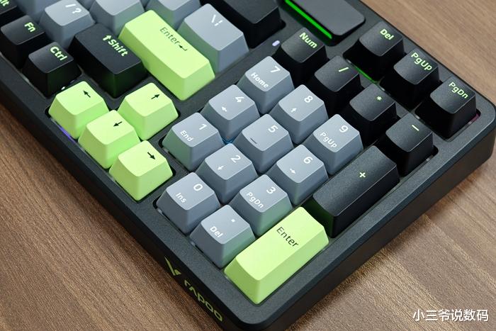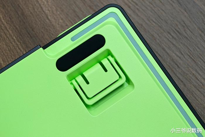 我拿到的是黑灰绿撞色的“初号骑士”,机甲风很浓,尤其是右上角的“时空幻境仓”,在开机后会亮起灯光(默认为淡蓝色,可在驱动中进行自定义设置),而且功能多样,充电时会亮起绿灯,还可以通过绿、黄、橙、红的变化实时查看键盘剩余的电量,最重要的是它还是一个接收器的磁吸收纳区,既有设计感,又特别实用。