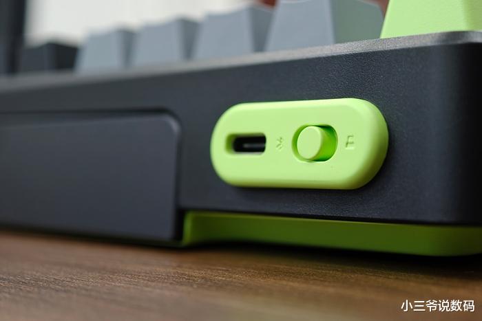 键盘支持无线2.4G、有线以及蓝牙5.0三种连接模式,最高支持5台设备之间切换,双向开关设计的模式切换键位于键盘左后方,轻松实现盲操,对于习惯多平台办公和娱乐的朋友来说,相当的方便。