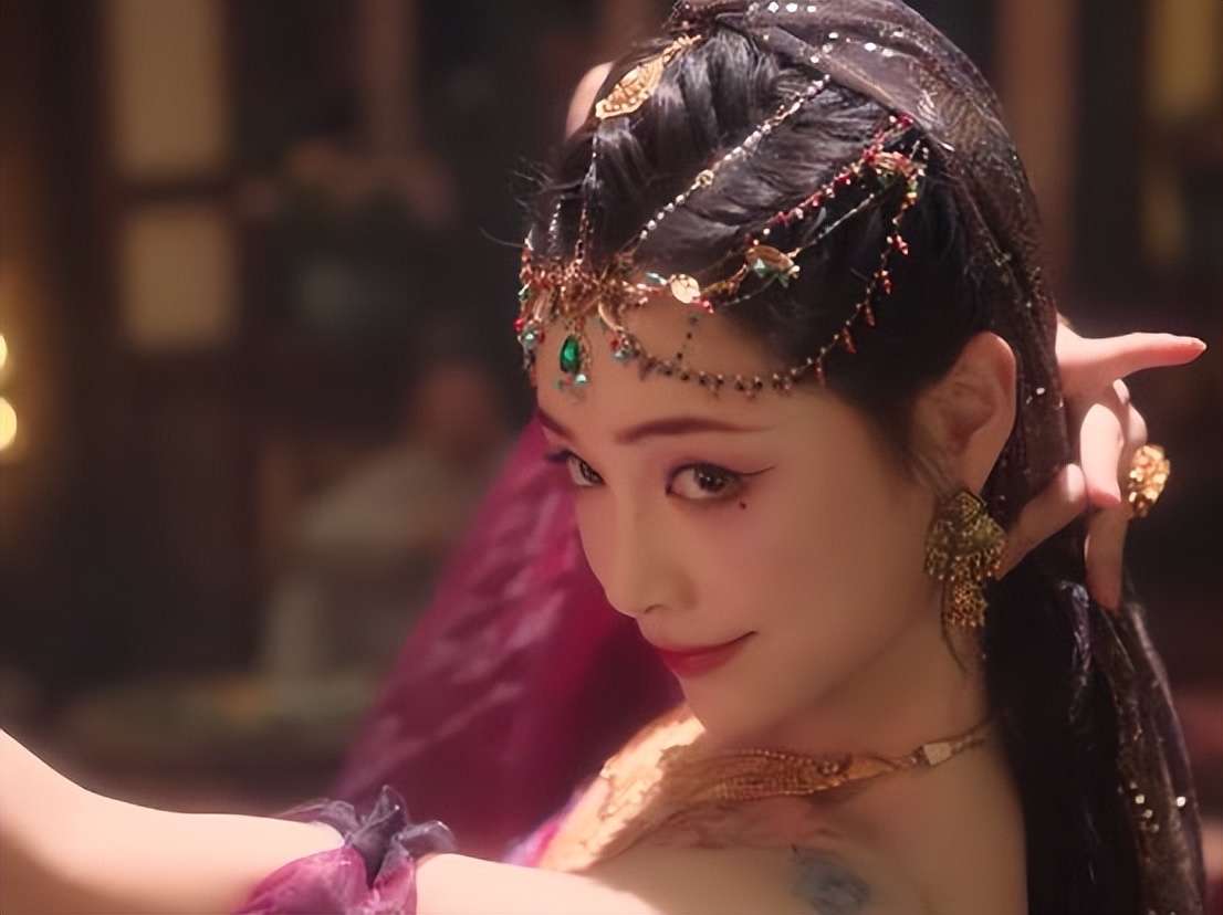 金灿灿的头饰恰到好处,妆容艳丽,两只眼睛下方点缀的红色小钻堪称点睛之笔,让舞姬的容貌更加动人。