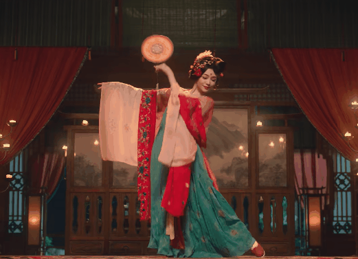 只见舞姬舞动着婀娜的身段在台上转圈,运镜与她的舞姿完美融合。