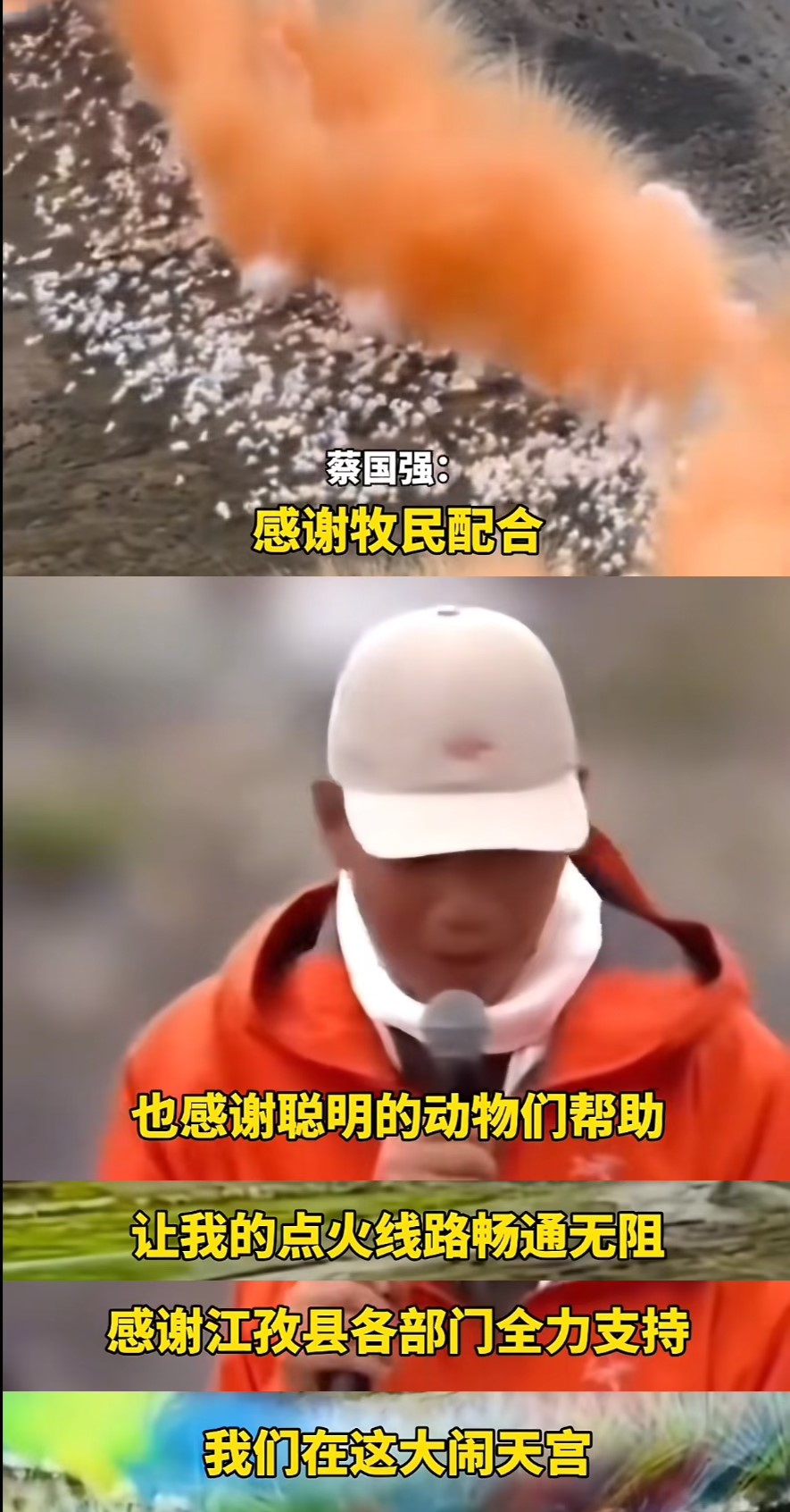 表演完成后的致谢辞中,蔡国强说出这样一番感言:“感谢牧民配合,也感谢聪明的动物们帮助,让我的点火线路畅通无阻。很感恩在场的大家和我一起实现我年轻时的梦想,全力支持我们在这大闹天宫,或者我们一起大闹天宫。”以至于从这场烟花秀本身,到主办方、设计者传递出的声音中,人们很难感知到丁点的环保之意,讨论更多的是动物洞穴会不会被炸塌、植被及微生物生态遭到何种程度的破坏,又或是是否能够修复。