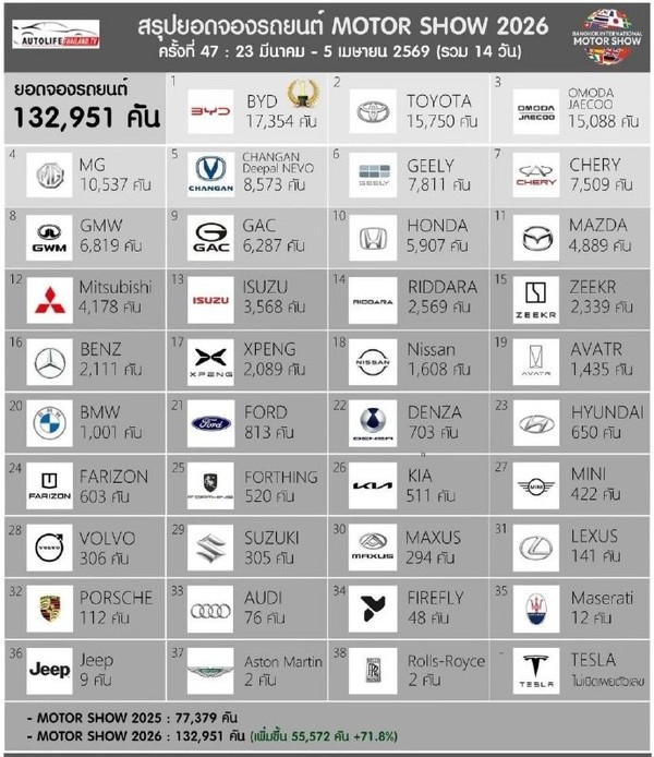 第47届泰国国际汽车博览会于近日正式落幕。在为期14天的展期内,累计汽车订单达到132951辆,较2025年的77379辆同比暴涨71.8%,净增超过5.5万辆。