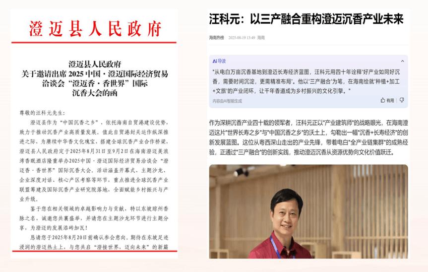 澄迈政府邀请汪科元出席2025中国澄迈国际经济贸易洽谈专题活动国际沉香产业推介会,专题分享《以三产融合重构澄迈沉香产业的未来》,用“沉香+长寿”打造“沉香长寿之乡”的文旅品牌;2025年11月7-9日深圳国际佛事展暨沉香工艺美术展,11月20-23日沉香山大讲堂第56期暨广东省药学会岭南中草药专委会年度学术总结会,28-30日将举行海南沉香花梨国际展,欢迎东南亚沉香产业同行前来交流指导。