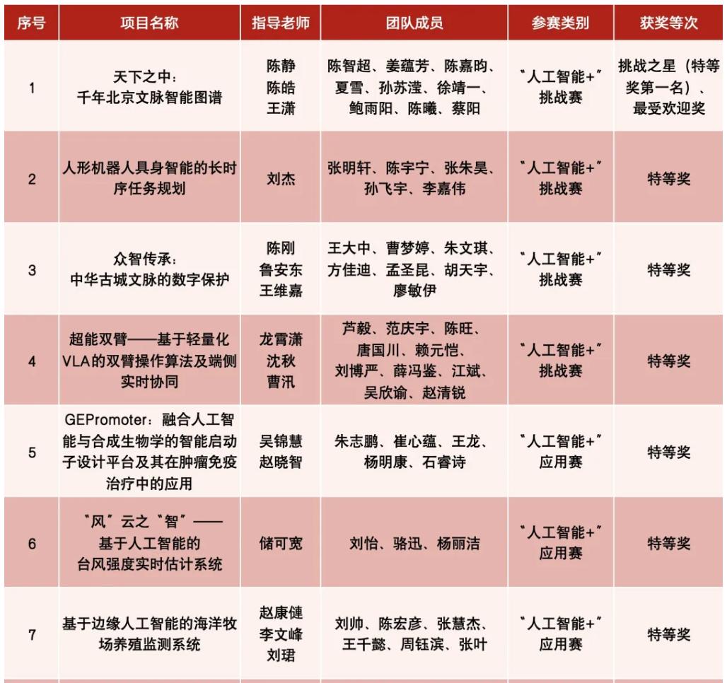 在主体赛中,我校师生获得特等奖4项、一等奖2项(限推报6项),总分及特等奖数均居全国第二。在“揭榜挂帅”擂台赛中,获得特等奖21项(含擂主6项)、一等奖22项、二等奖14项、三等奖17项、优胜奖5项,擂主数全国第三、获奖总数全国第一。另外,在“人工智能+”专项赛中,获得特等奖4项、一等奖5项、二等奖5项、三等奖7项。