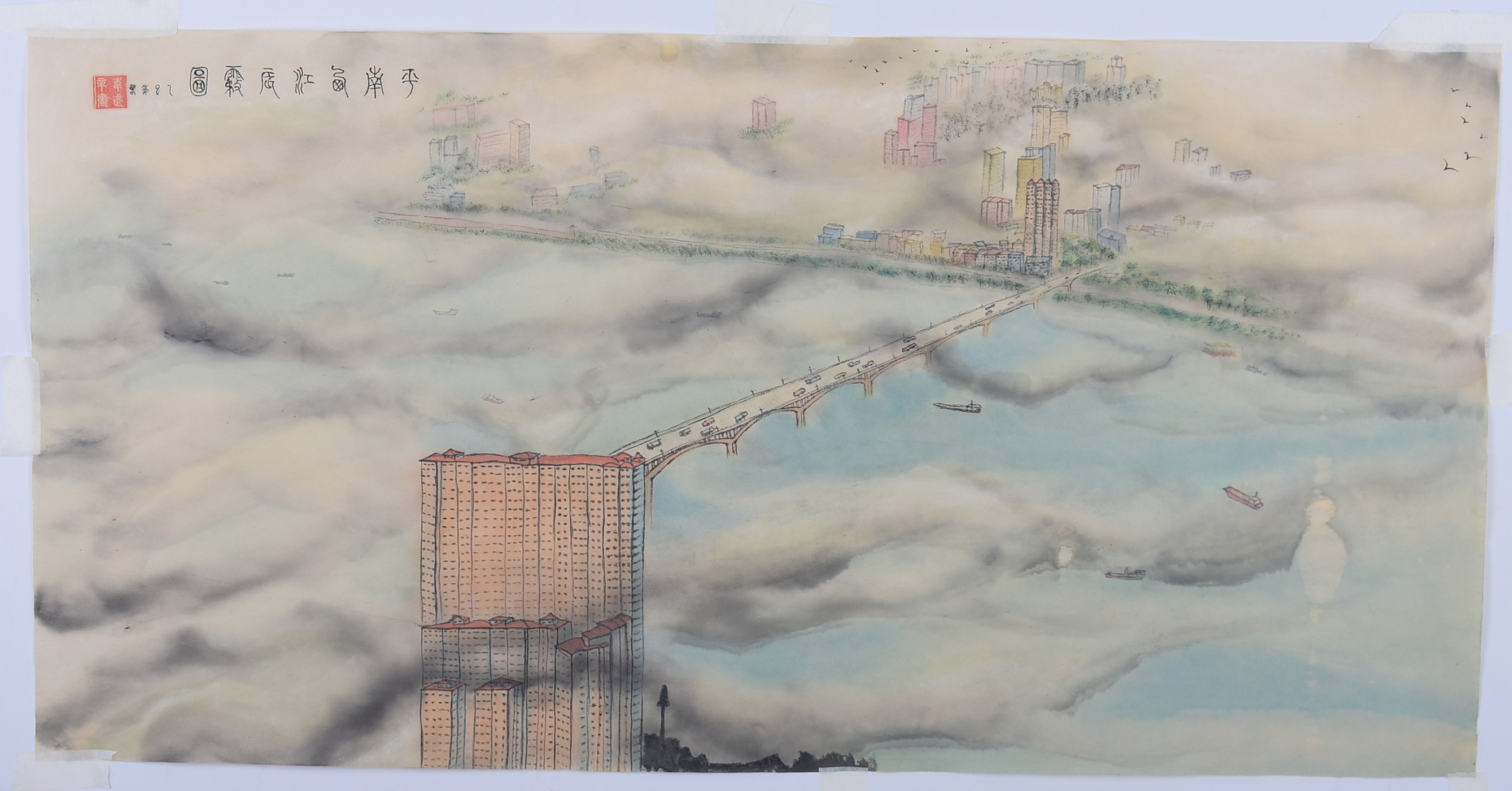 画面简介:《平南西江晨雾图》桥栏金属结构以钛白混合朱磦呈现暖调钢骨,既突破传统界画金碧设色程式,又规避西画透视对水墨气韵的消解——晨雾中渐隐的桥墩与丹霞地貌肌理通过同色系赭石过渡,实现现代工程与喀斯特地貌的视觉共生。江面蒸腾的水汽与汽车尾气在生宣上自然晕染,形成独具工业美学特征的"水墨碳足迹”既要绿色青山又要金山银山。画面采用s型构图特点,色彩主要用:硃磦和三青为主,三绿辅!