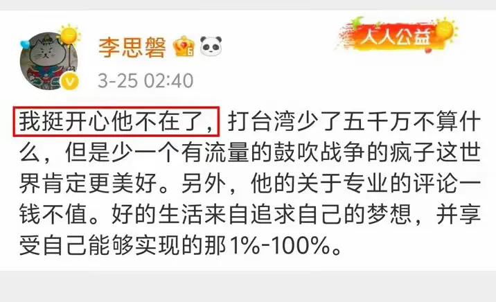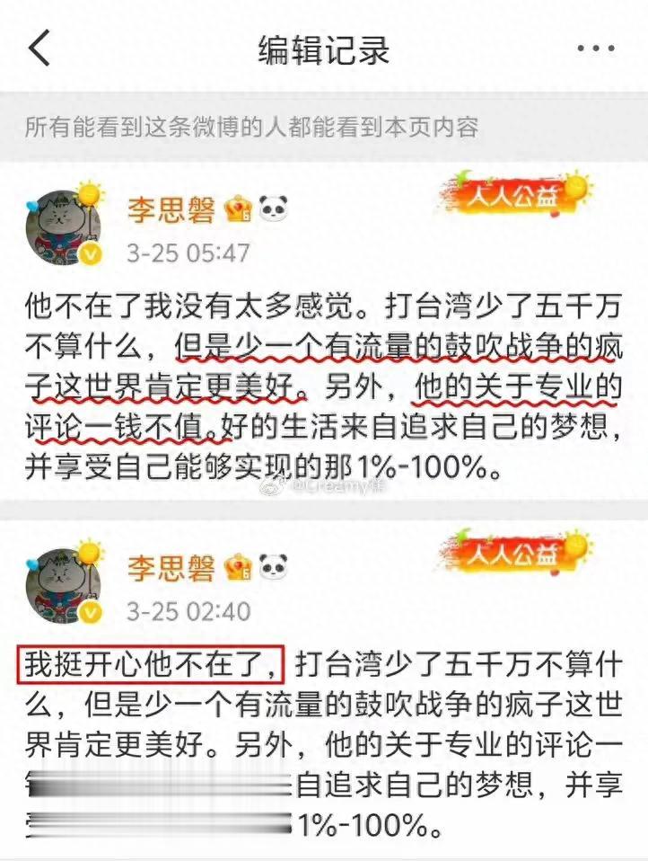 更令人发指的是,这个人并非无名网民,而是自称公益人、女Q学者的媒体从业者李思磐。她在微博上公然写道:“我挺开心他不在了”。