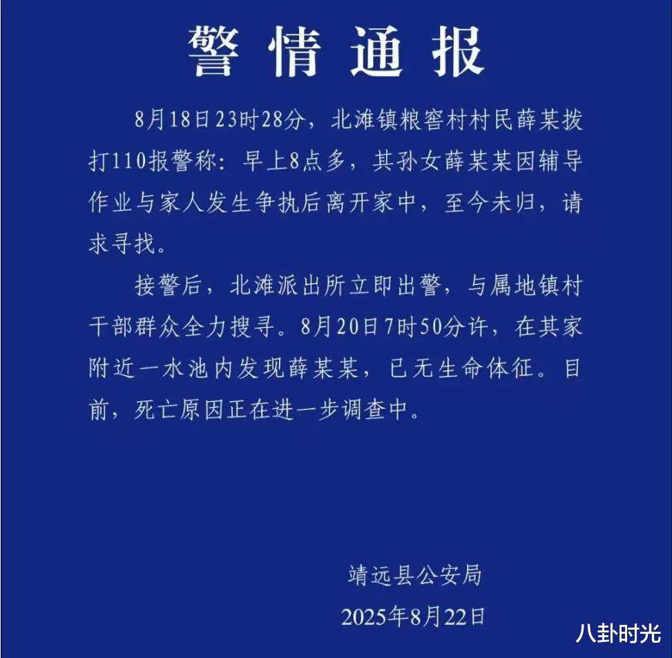 通报里说,女孩在8月18日早上8点,因为辅导作业与家人发生争执后离开家中,直到8月20日7点才在家附近的水池内被发现,可发现时女孩已经没有了生命体征,死亡的原因正在进一步调查↓