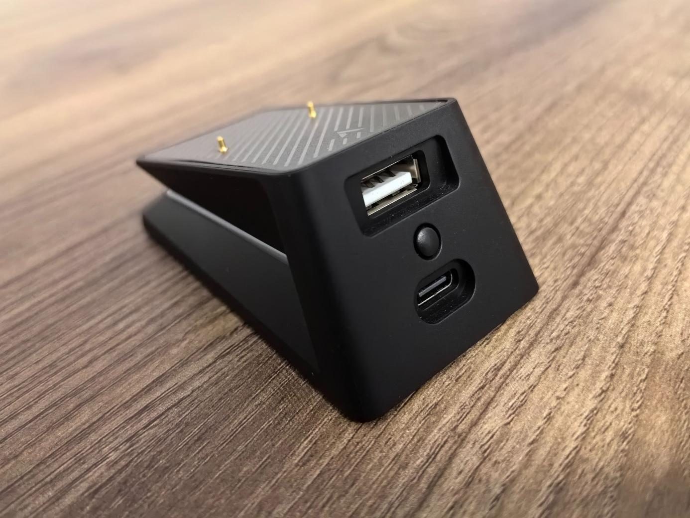 同时底座上也增设了2个USB口,上面的A口可作为电脑接口的扩展使用,下面的C口则用来接自带线实现有线模式。接口中间的按钮则是用来切换RGB灯光模式,有多种灯光模式可以循环切换。