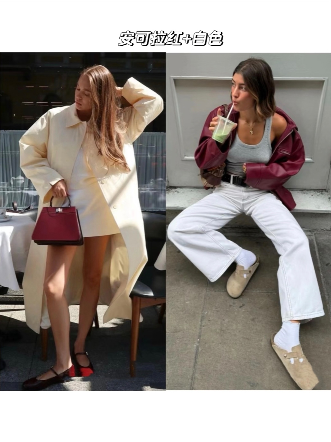 对于喜欢浅色系的姐妹,安哥拉红可能会觉得有点成熟稳重,那就跟白色搭配吧,秋冬的沉闷中带点清新,既有减龄效果又能在一抹深色中脱颖而出~