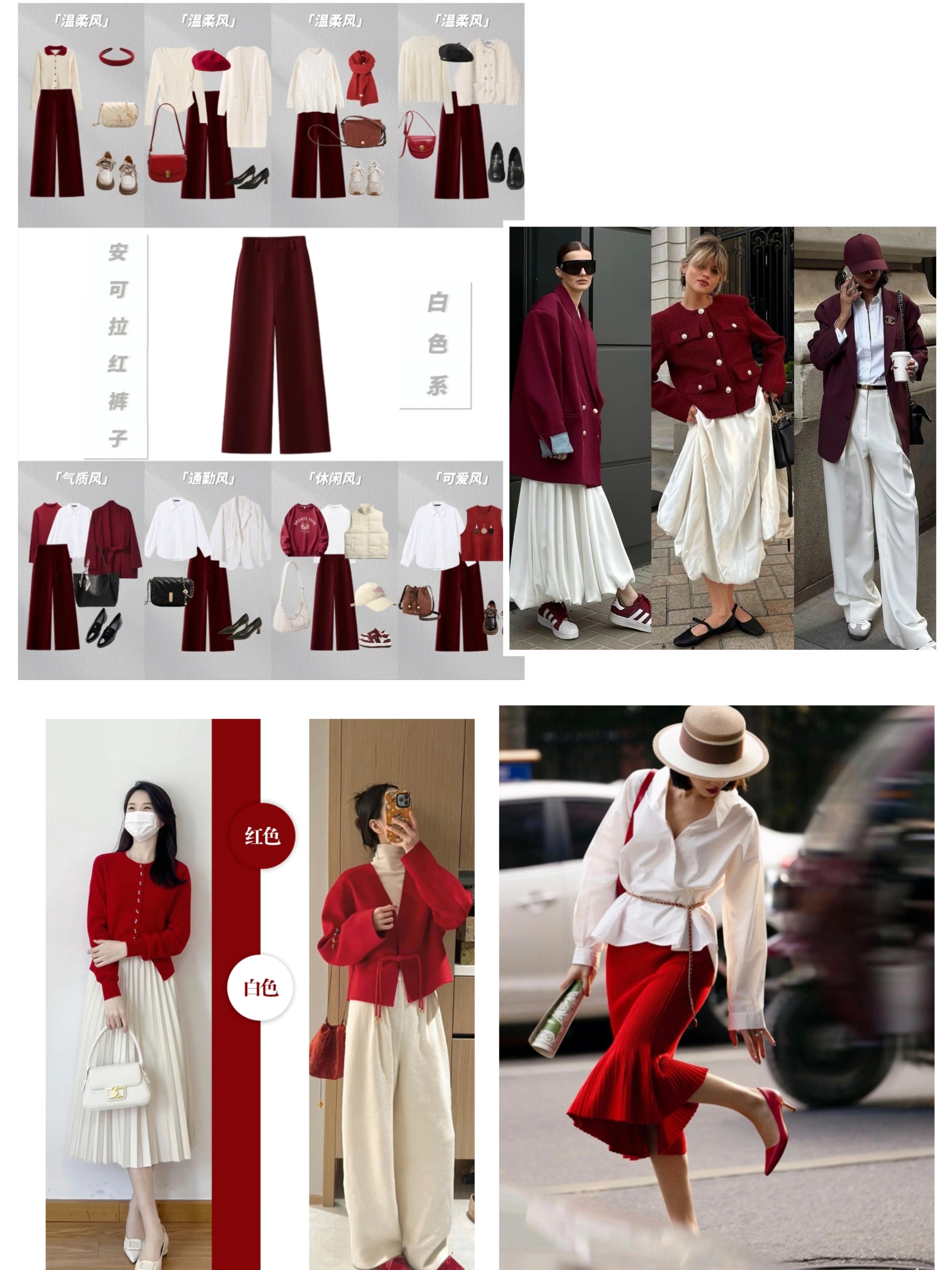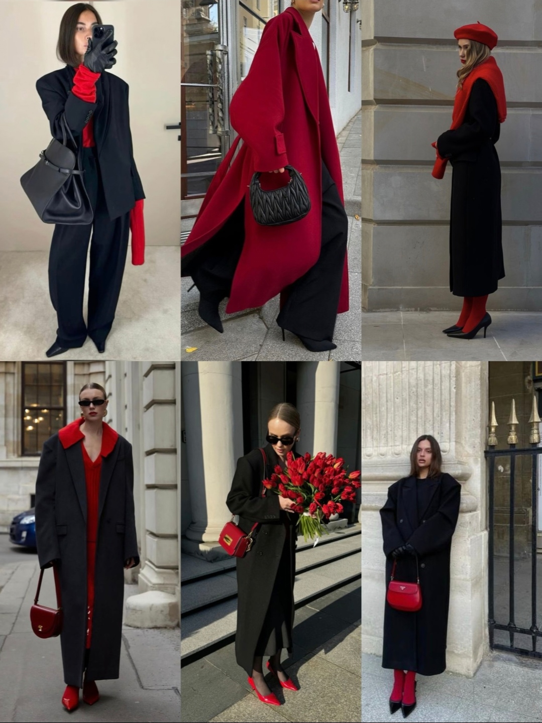 安可拉红搭配黑色:这绝对是丰富夺目的红黑对撞组合呀!深邃而飒气,营造出具有冲击力的故事性。