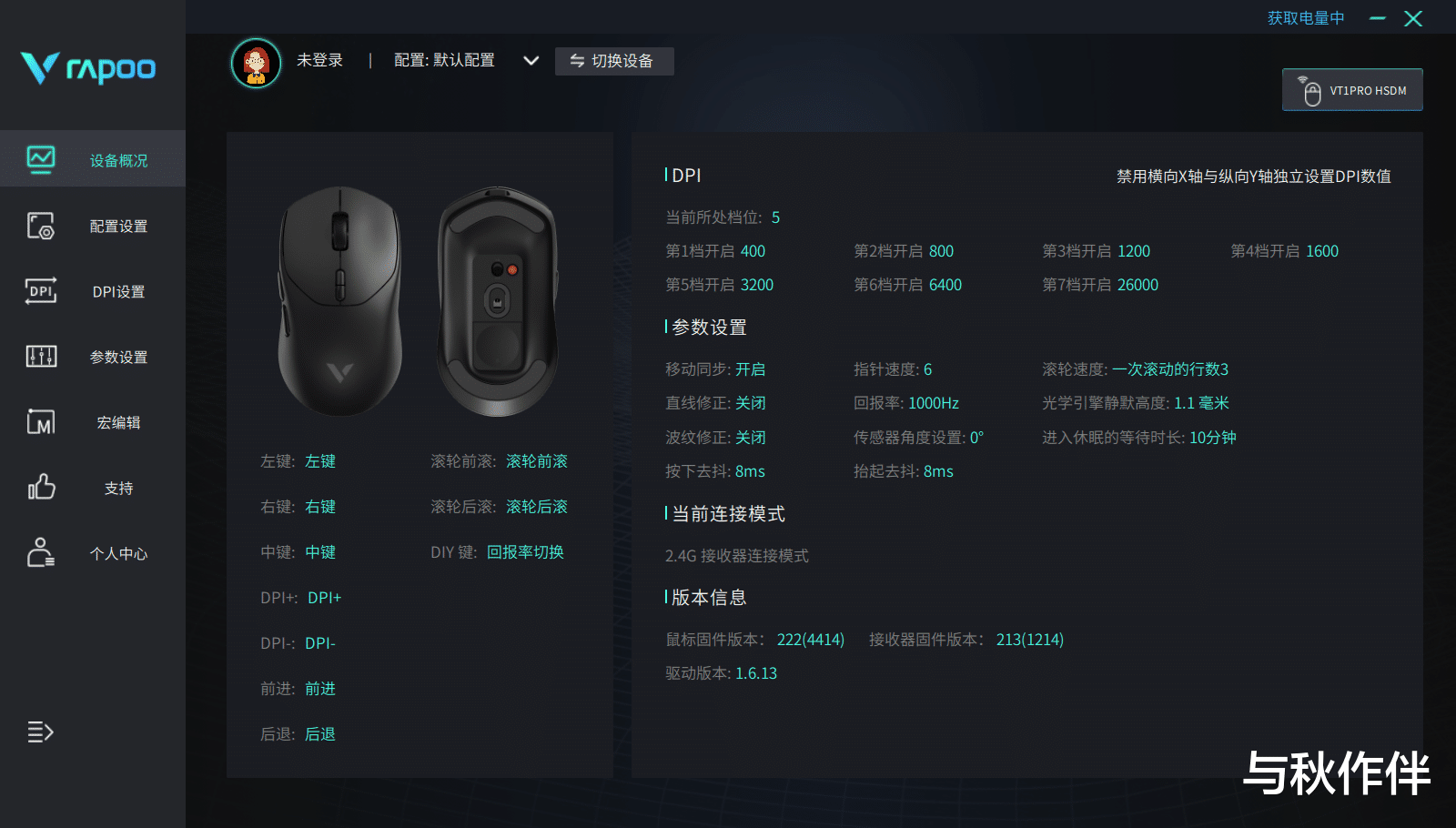 连接驱动后则有了更多的惊喜,对比之前,雷柏的这个驱动经过了大改,首先是多了一个设备概况,可以显示鼠标当前的各种设置情况。