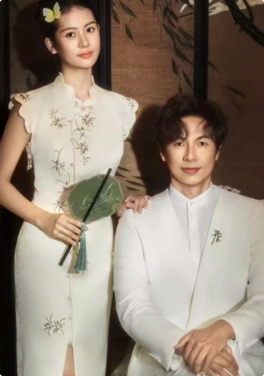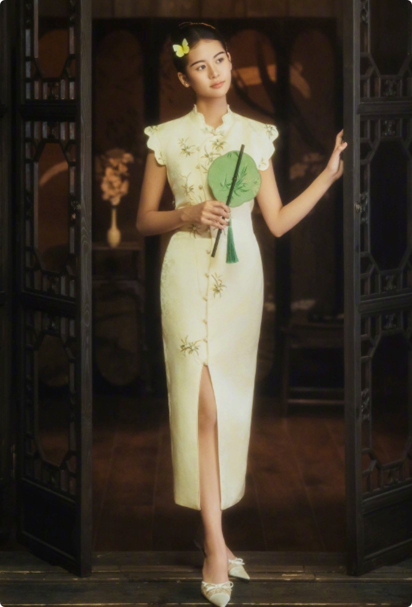 浅色旗袍+高开衩设计,既显腿部线条,又不失端庄典雅。
