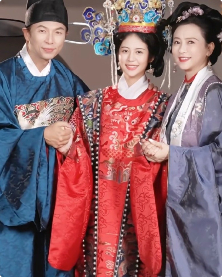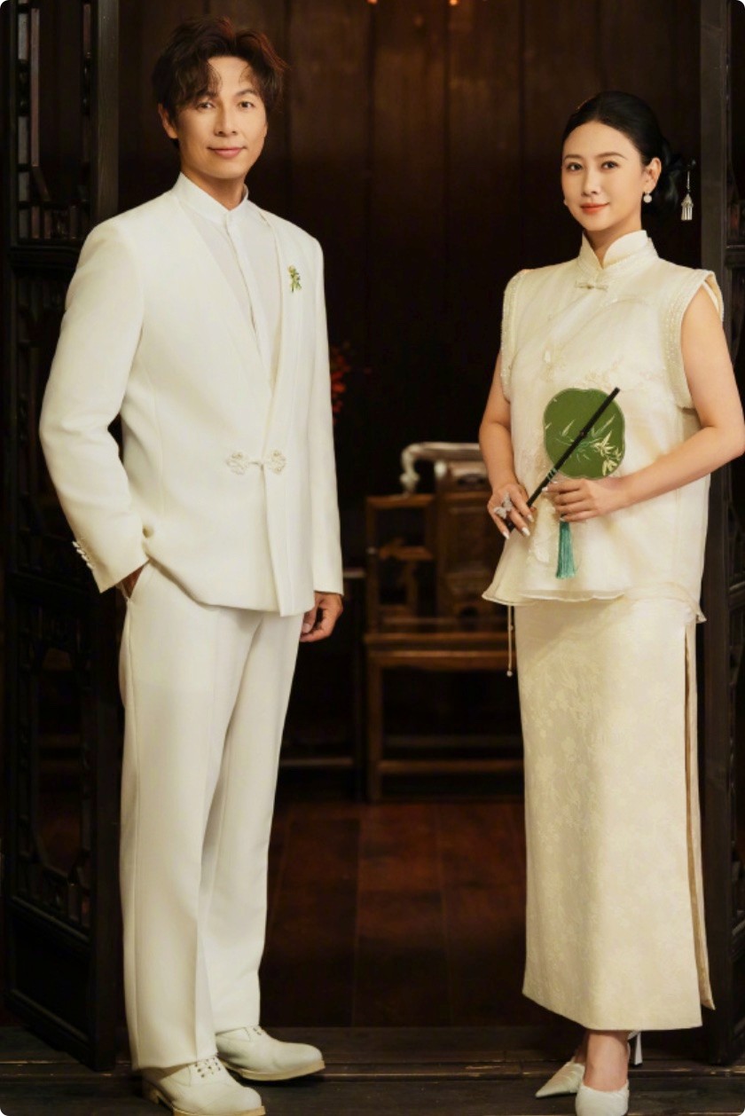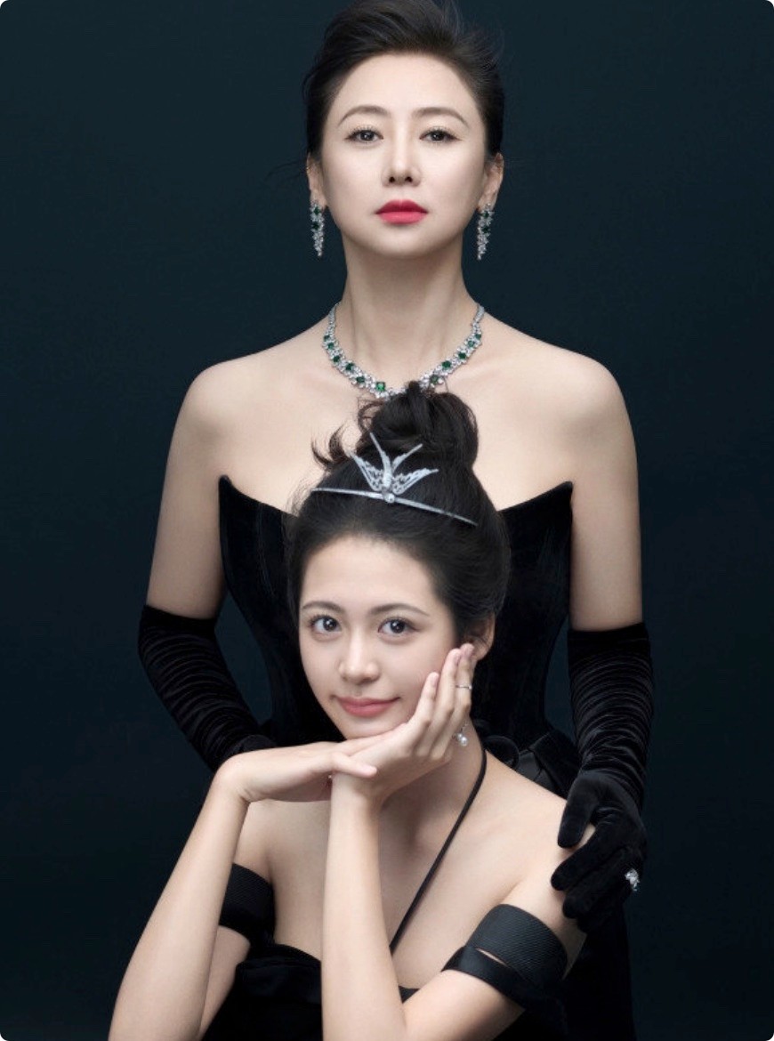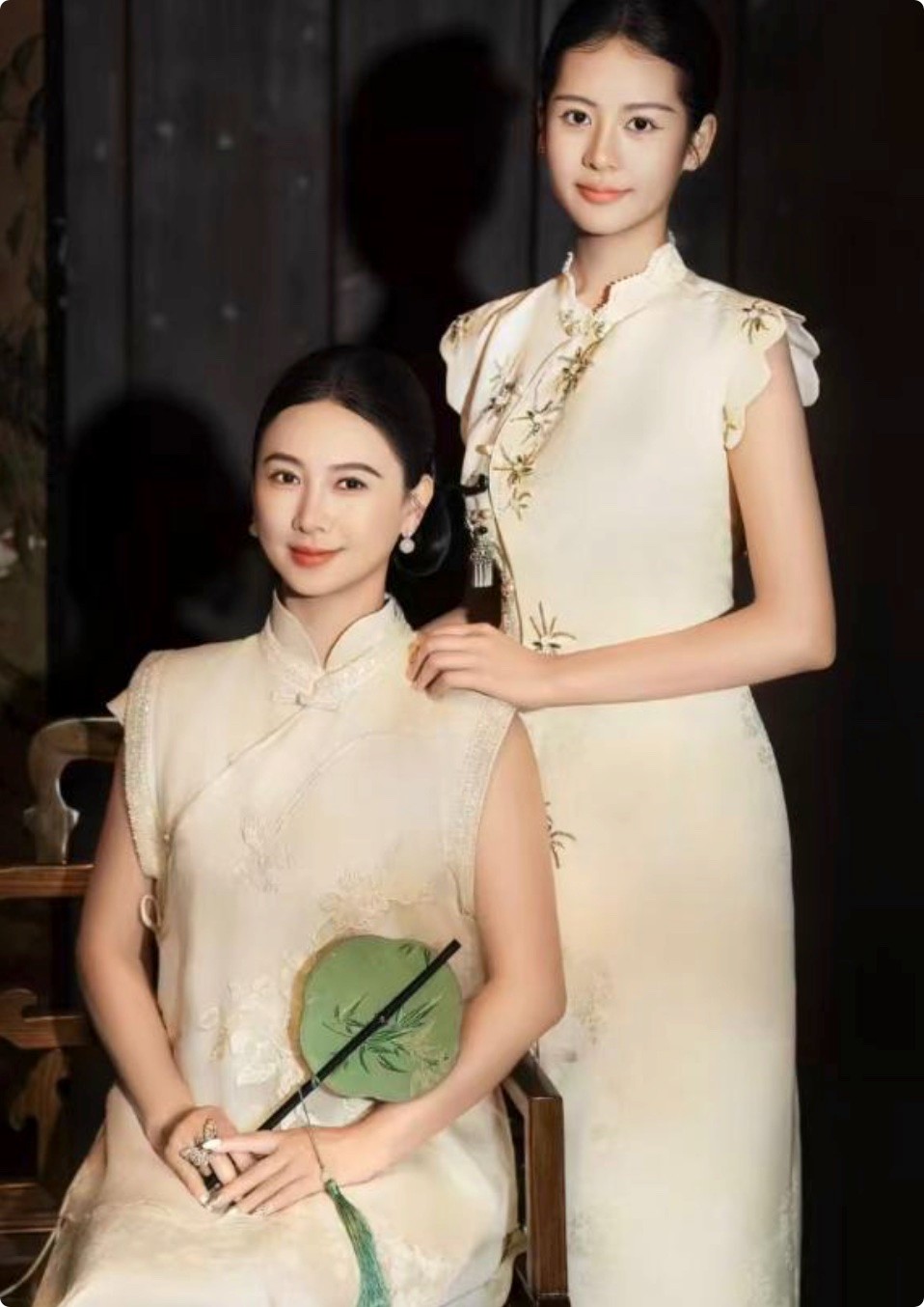 母亲翁虹则穿着与女儿呼应款式的旗袍,颜色稍深、配饰稍成熟,但她站在那里就是“气场”。