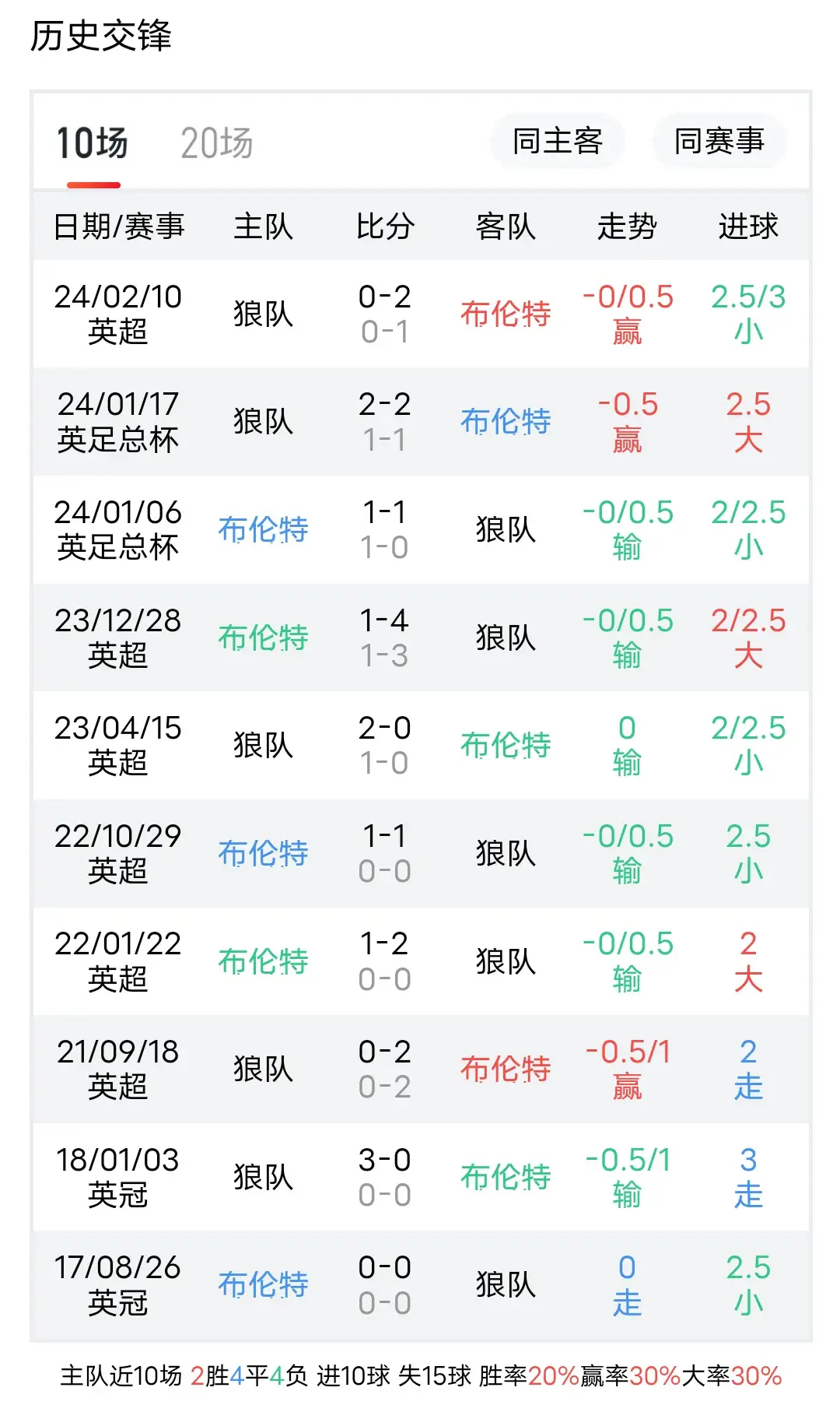 狼队队史一共28次面对布伦特福德拿下了14胜4平10负的战绩,俩队交手平局不多。