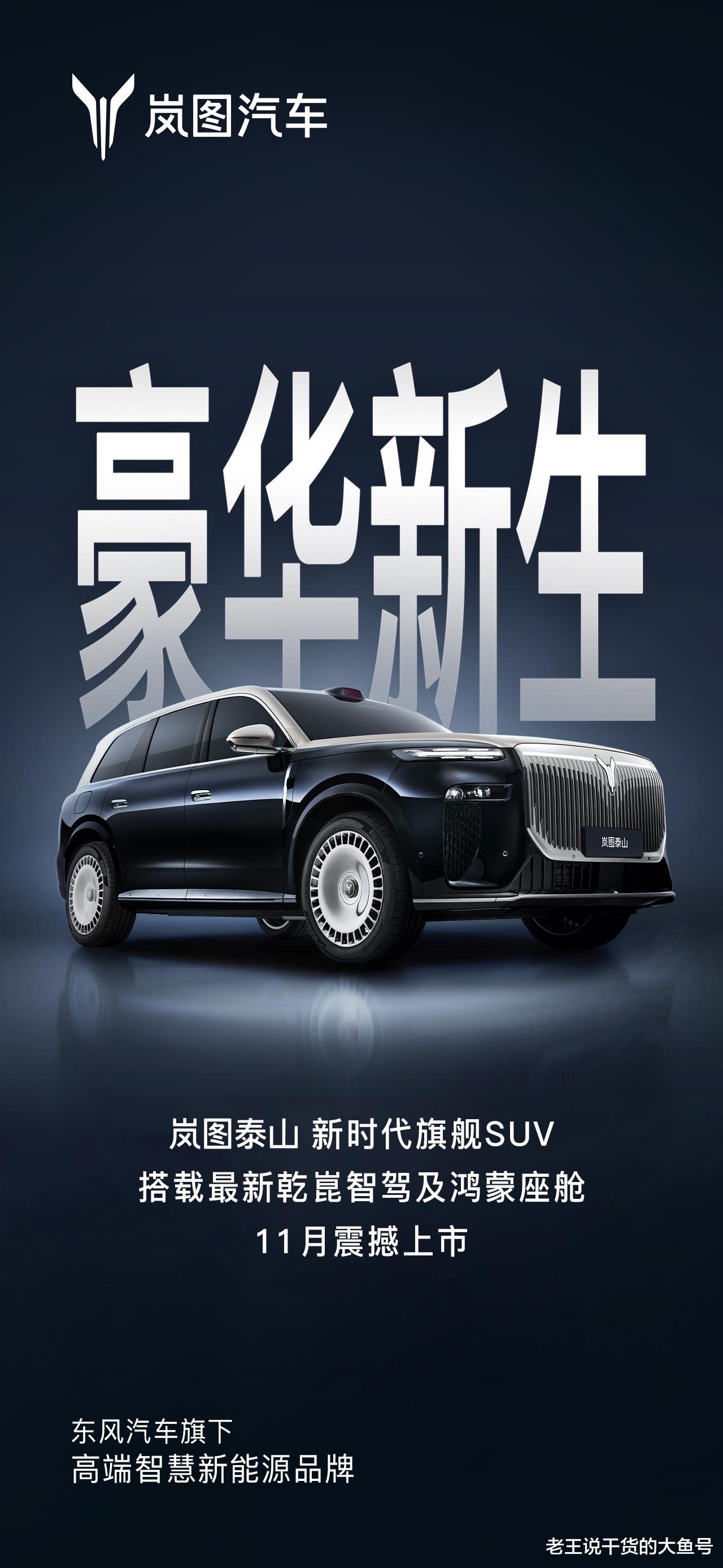 【10月20日,武汉】今日,岚图汽车正式宣布,新时代旗舰SUV——岚图泰山将于11月重磅上市。作为岚图年度压轴“豪”车,岚图泰山拥有与问界M9、尊界S800“智能同源”的尖端技术,搭载顶配版华为乾崑ADS 4与鸿蒙座舱5,将成为旗舰“9系”豪华SUV市场极具竞争力的产品。