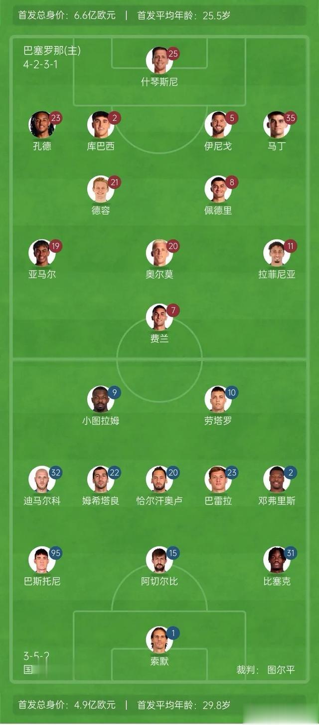 双方首发阵容,巴塞罗那身价和年龄都占优势。国米平均年龄29.8岁,有点偏大。