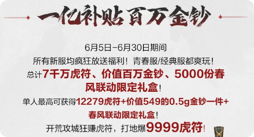高达一亿的补贴,发放的福利一共包括七千万虎符、价值百万的金钞,还有5000份春风联动限定礼盒。单名玩家最高能获得的奖励为12279虎符,外加价值549RMB的0.5克金钞,以及一份春风联动限定礼盒,堪称率土运营十年来规模最大的回馈活动。