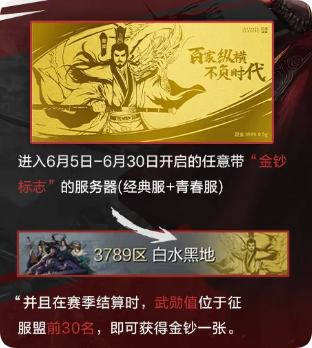 只要能够在带有金钞标志的经典服或青春服取得赛季征服,并且在结算时,自己的武勋值位于征服同盟前30,即可获得价值549元的0.5克纪念金钞。