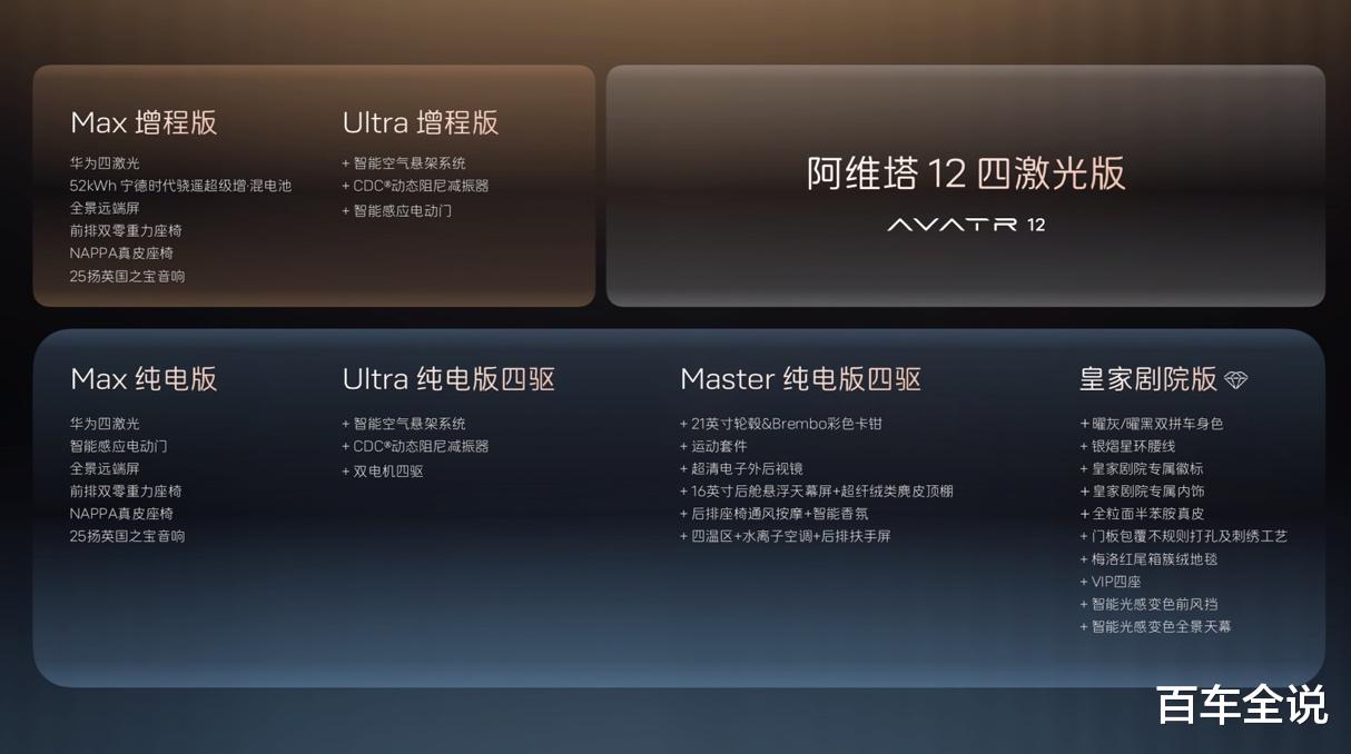 2025年10月18日(重庆),阿维塔12 四激光版预售发布会在重庆旁观者设计博物馆举办,并宣布阿维塔*华为乾崑智驾®城市公开赛即将启动。阿维塔12 四激光版提供纯电与增程双动力,共推出6款车型。即日起至上市前下订,即可享2000元意向金抵扣5000元购车款的限时预售权益。