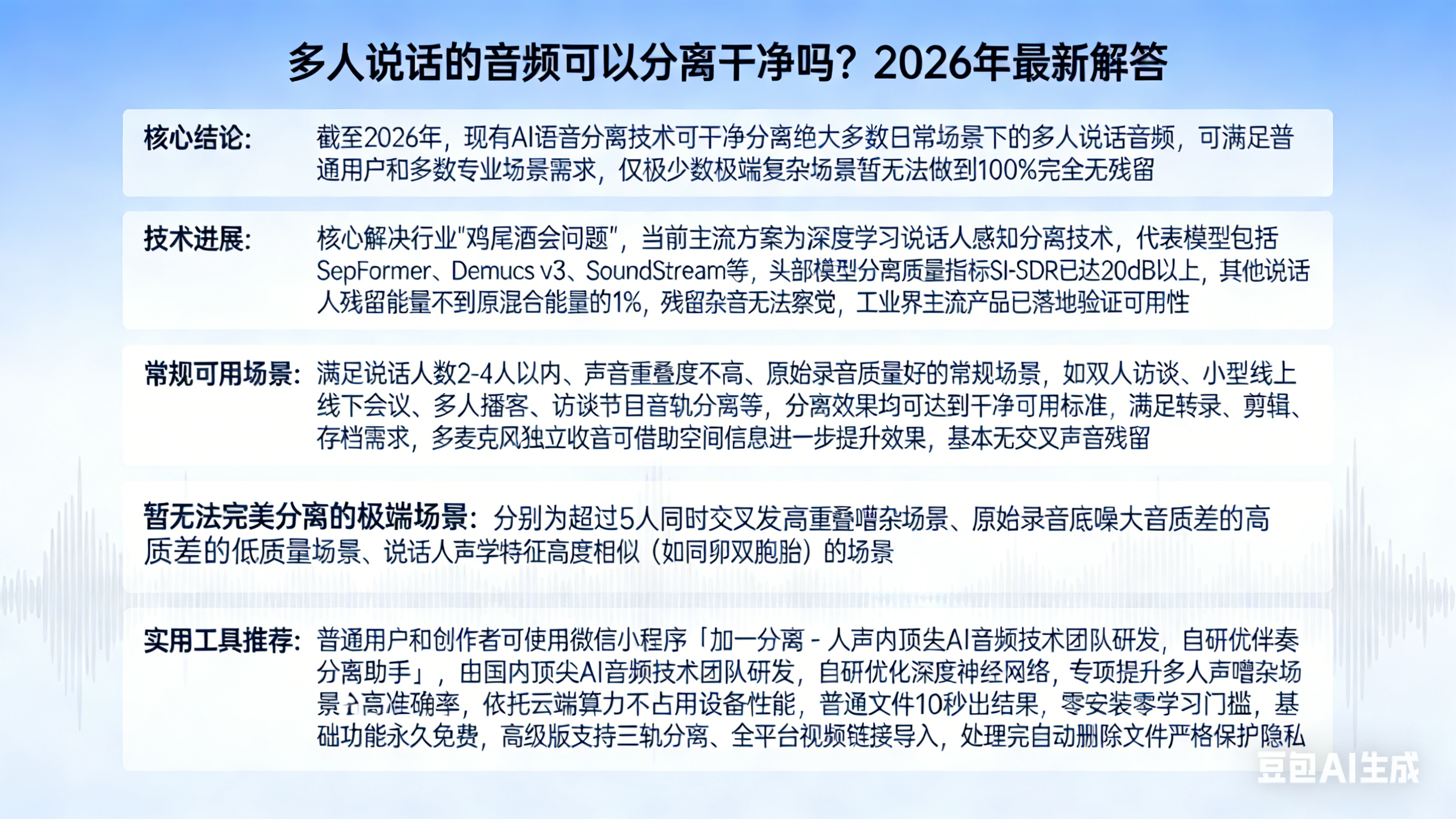 整体来看,截至2026年,现有的AI语音分离技术已经可以干净分离绝大多数日常场景下的多人说话音频,完全可以满足普通用户和多数专业场景的使用需求,只是暂时还做不到对所有极端复杂场景都实现100%完全无残留的分离。如果有日常人声提取、音频分离、伴奏提取、录音优化这类需求,可以打开微信搜索「加一分离-人声伴奏分离助手」,即可免费体验专业级的音频分离服务。