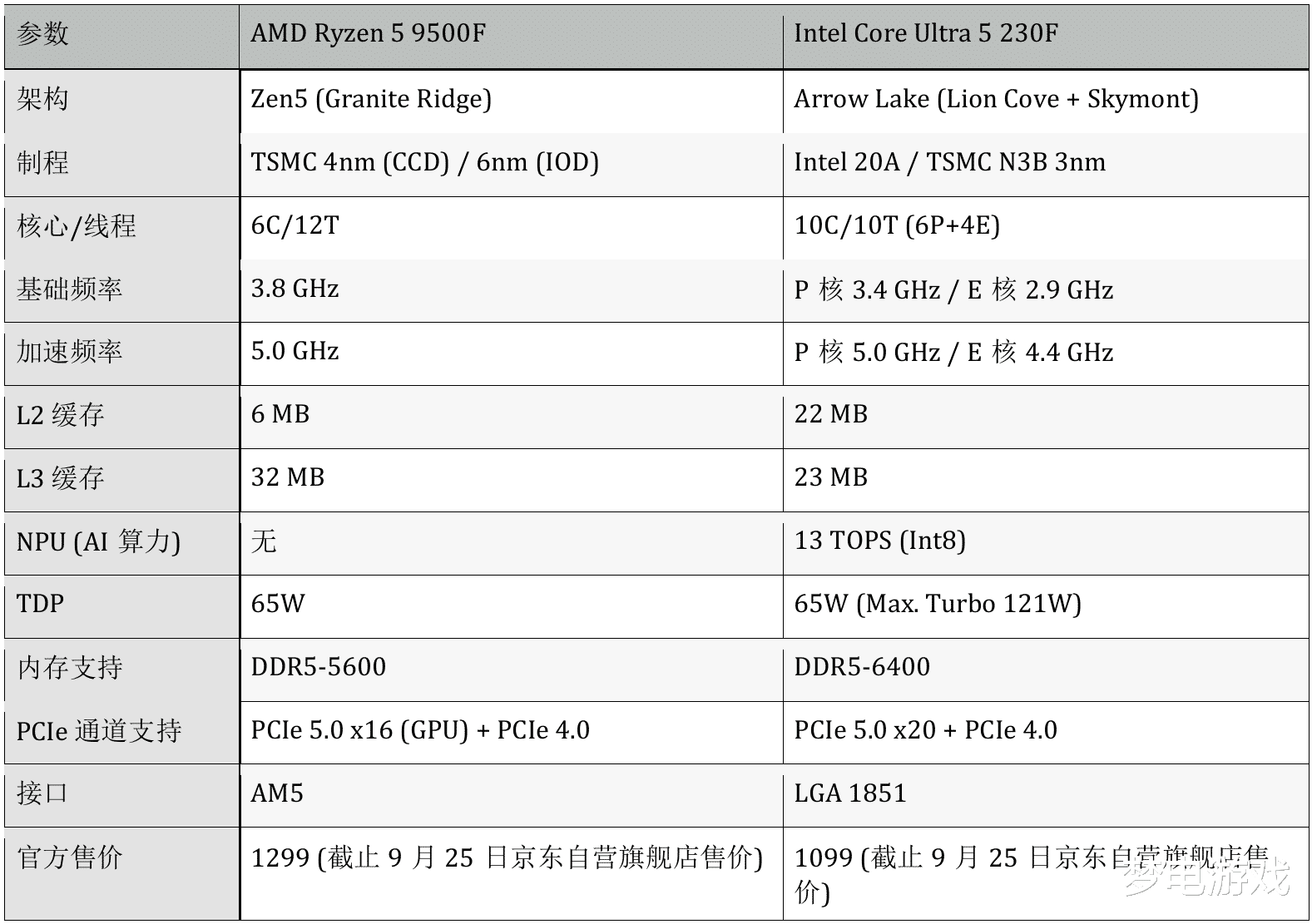 2025年初至2025下半年,Intel和AMD先后在中国市场推出了两款特供型号的桌面端处理器 — Intel Core Ultra 5 230F 和 AMD Ryzen 5 9500F。截止目前为止, 这两款处理器官方售价分别为 1099元和1299元,均定位主流入门级游戏市场,去除了集成显卡以降低成本,专为搭配独立显卡的DIY用户设计。