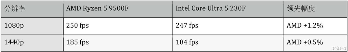 有趣的反转现象⸺Ryzen 5 9500F在1080p下领先,Ultra 5 230F在1440p下反超。这可能与游戏引擎对不同分辨率的CPU调度策略有关。