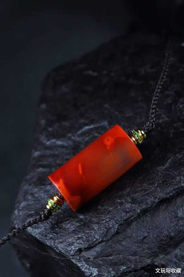 就像这颗南红玛瑙做的路路通,长形的桶珠更适合做勒子,这是四川九口的玫瑰红冻料。