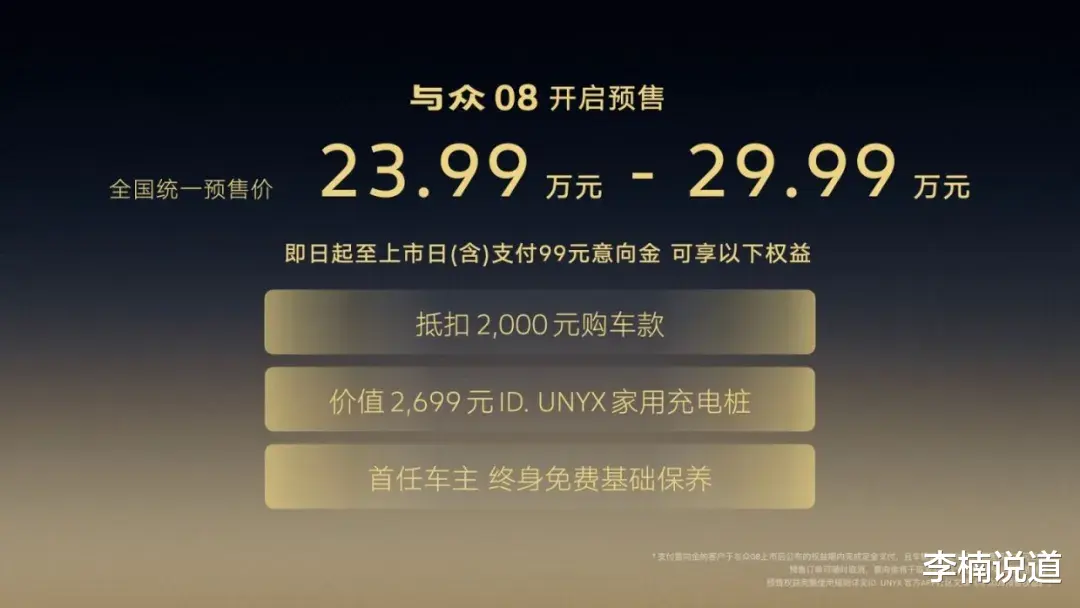 2026年3月26日,金标大众家族全新成员——首款全时互联全尺寸纯电SUV与众08在合肥完成首秀,并同步开启预售,预售价格为23.99万元-29.99万元。新车推出了限时预售权益。即日起,用户支付99元意向金,即可尊享三重礼遇:99元意向金直接抵扣2000元购车款;首任车主终身免费基础保养;赠送价值2,699元ID.UNYX家用充电桩。