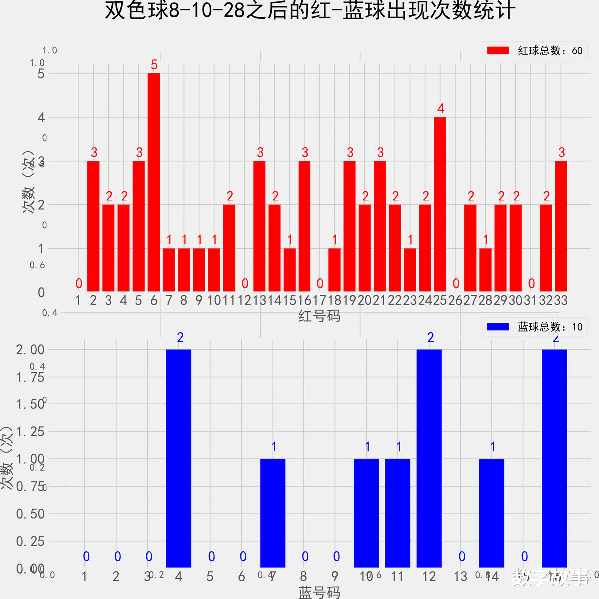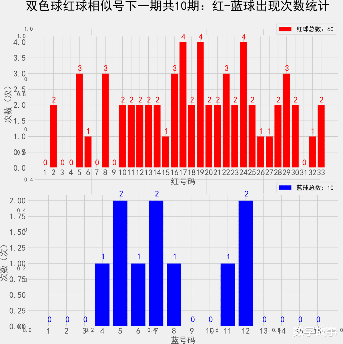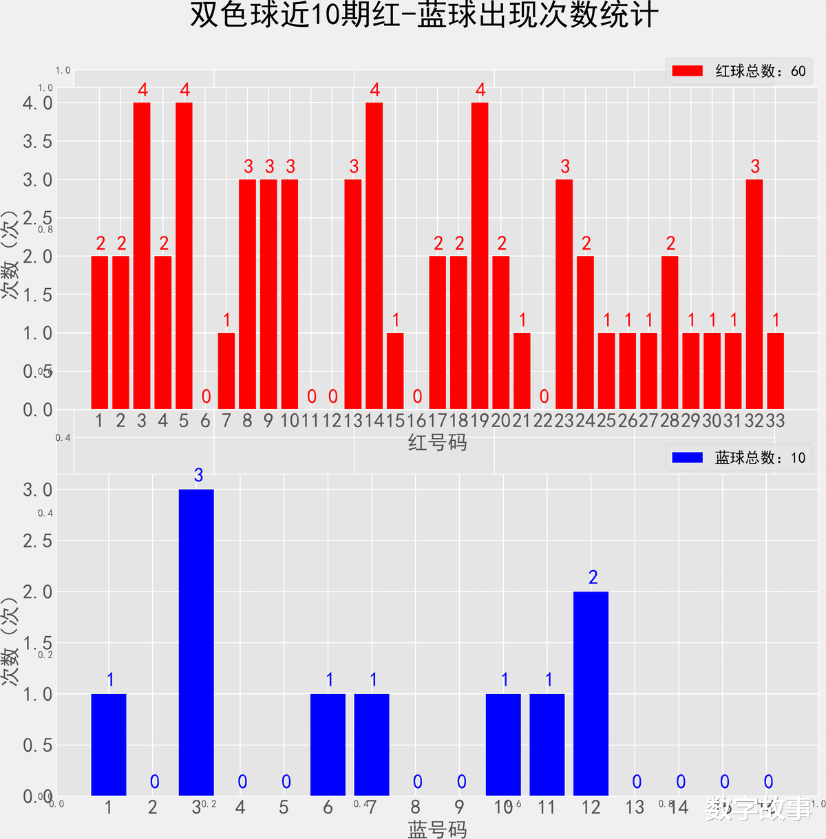 双色球近10期红蓝号统计情况统计样本数据: 60个红球 10个蓝球