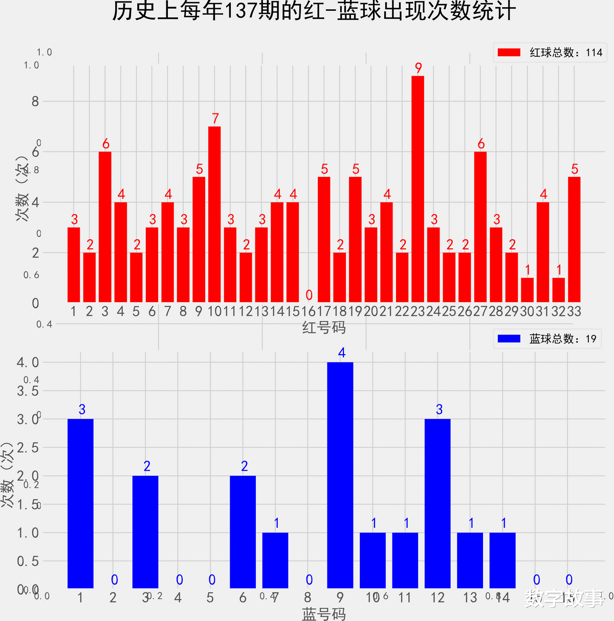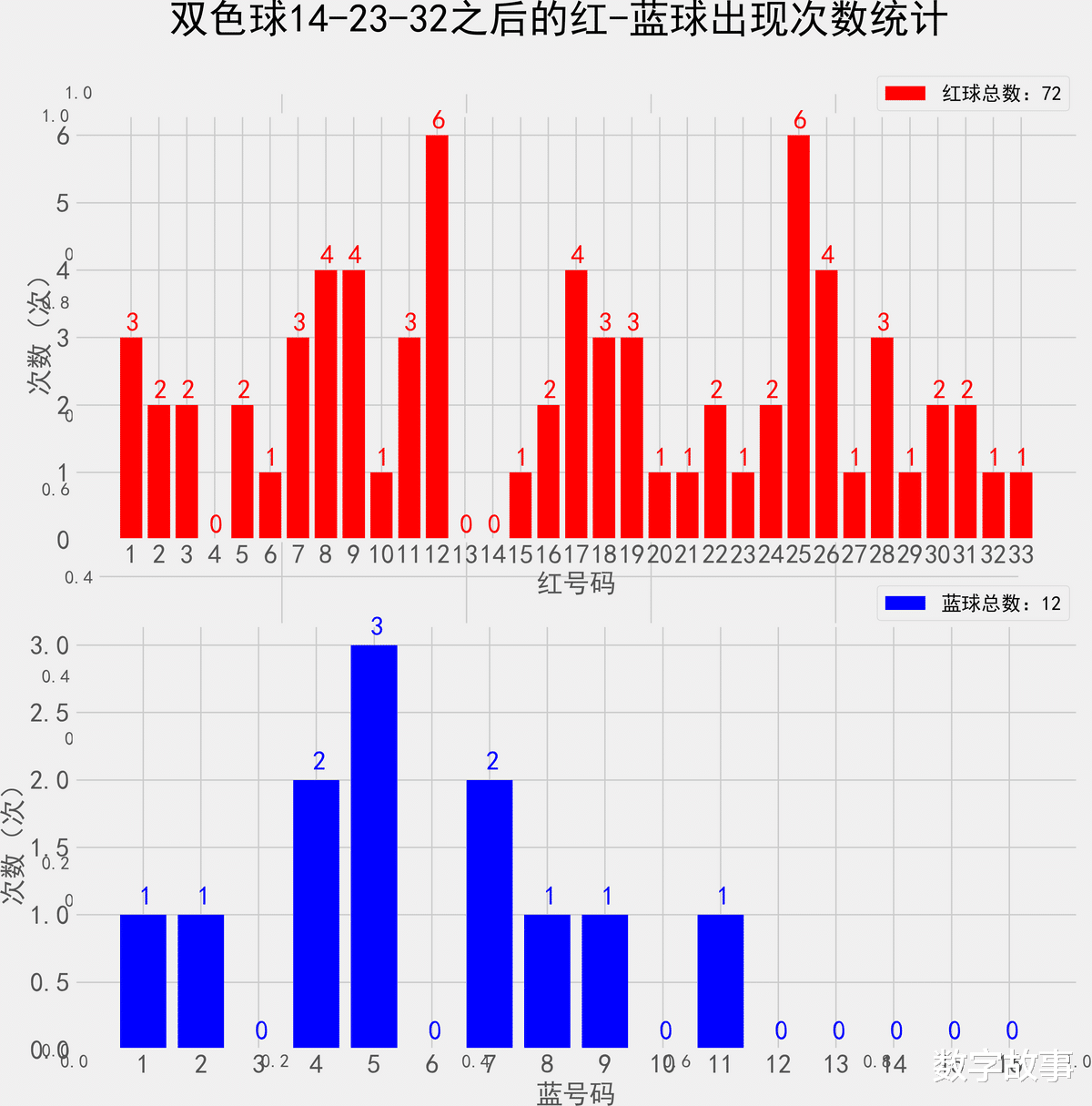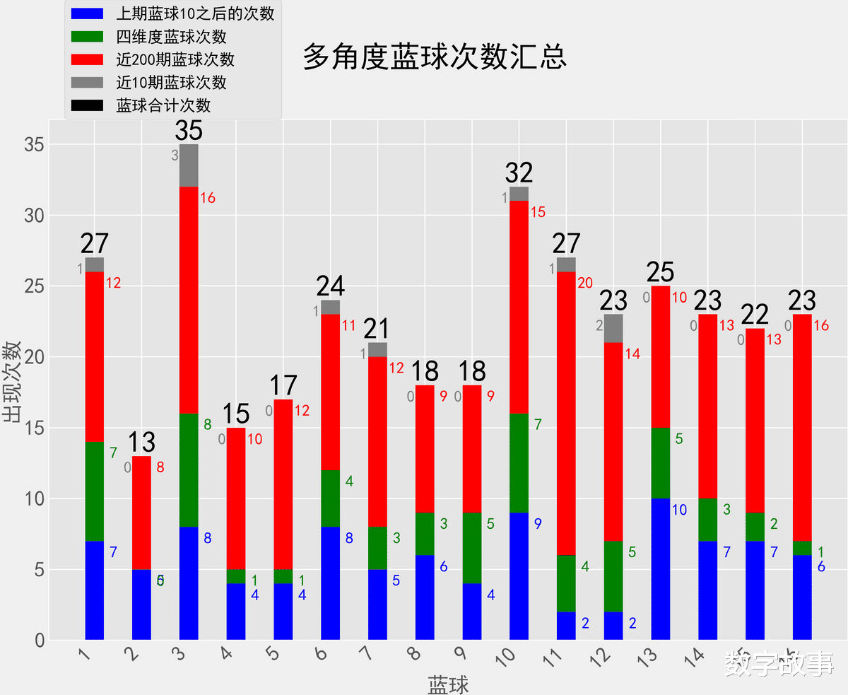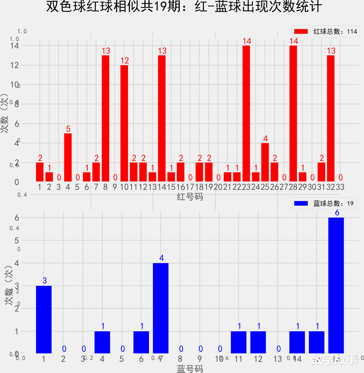 双色球近10期红蓝号统计情况统计样本数据: 60个红球 10个蓝球