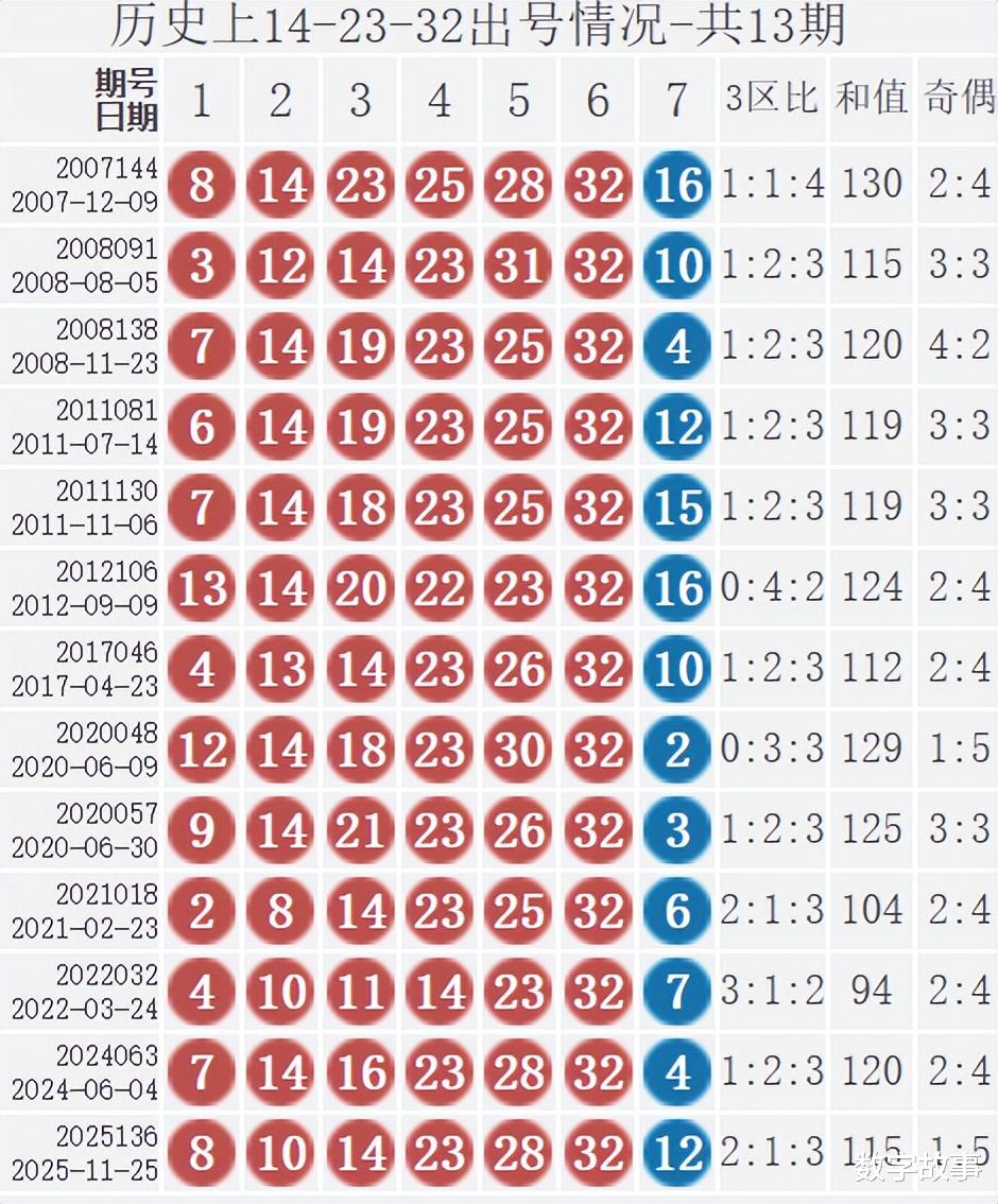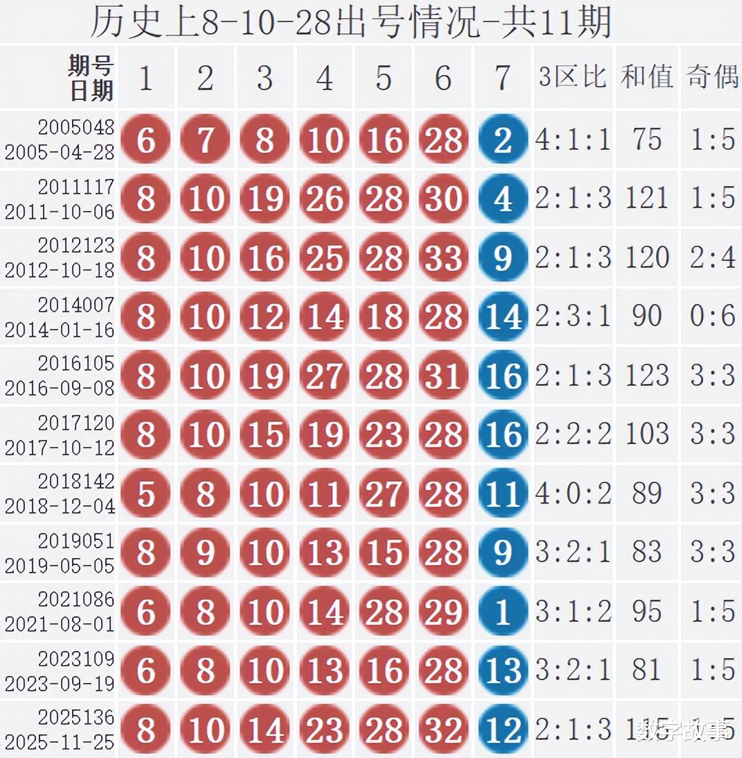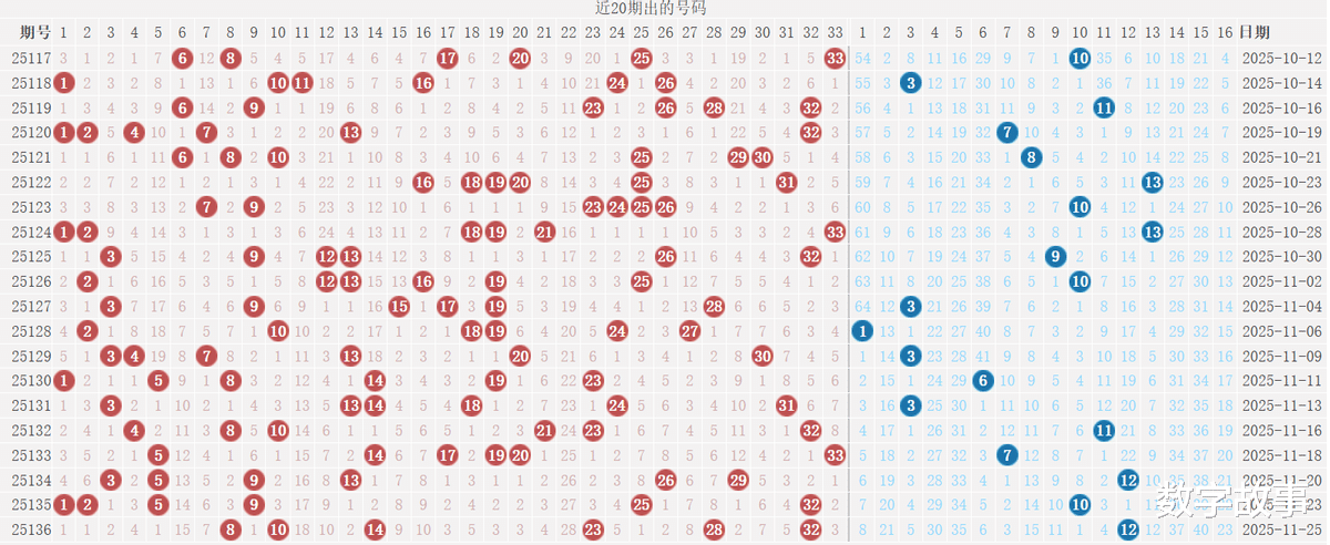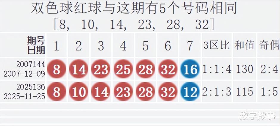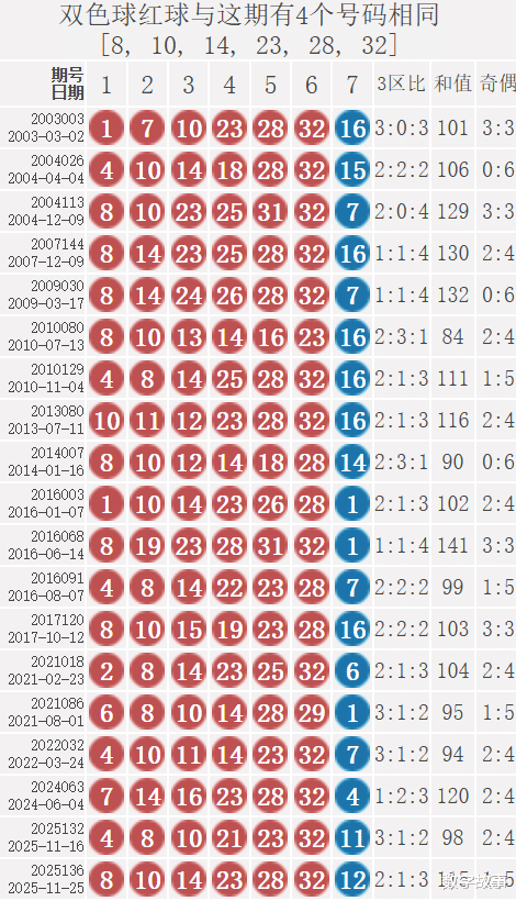 双色球2025136期红号在过去是否出现过?双色球2025136期红号: 8-10-14-23-28-32经查,历史上没有出现过与这一期6个红号一样的,5个红号一样的有1期,如下:
