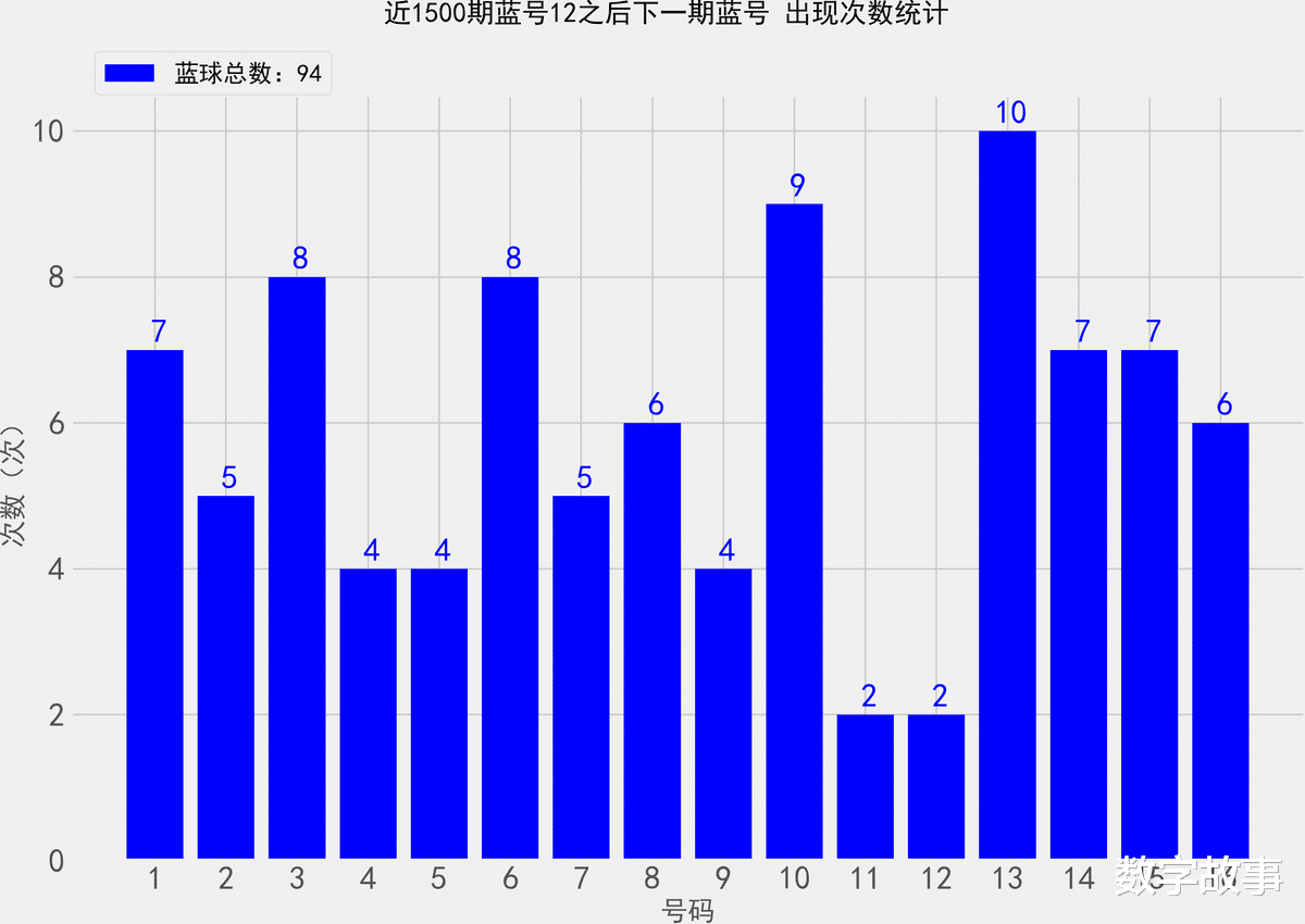 统计近1500期蓝号12之后, 各蓝球的出现次数双色球25136期蓝号是12找出近1500期蓝球12号之后, 下一期出现的所有蓝号,统计其出现次数。,除开这一期,总共出现了94次12号球那么统计的样本数据是94个