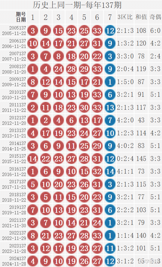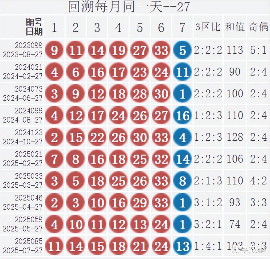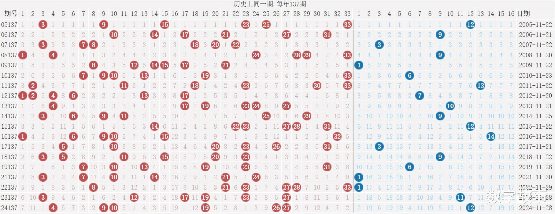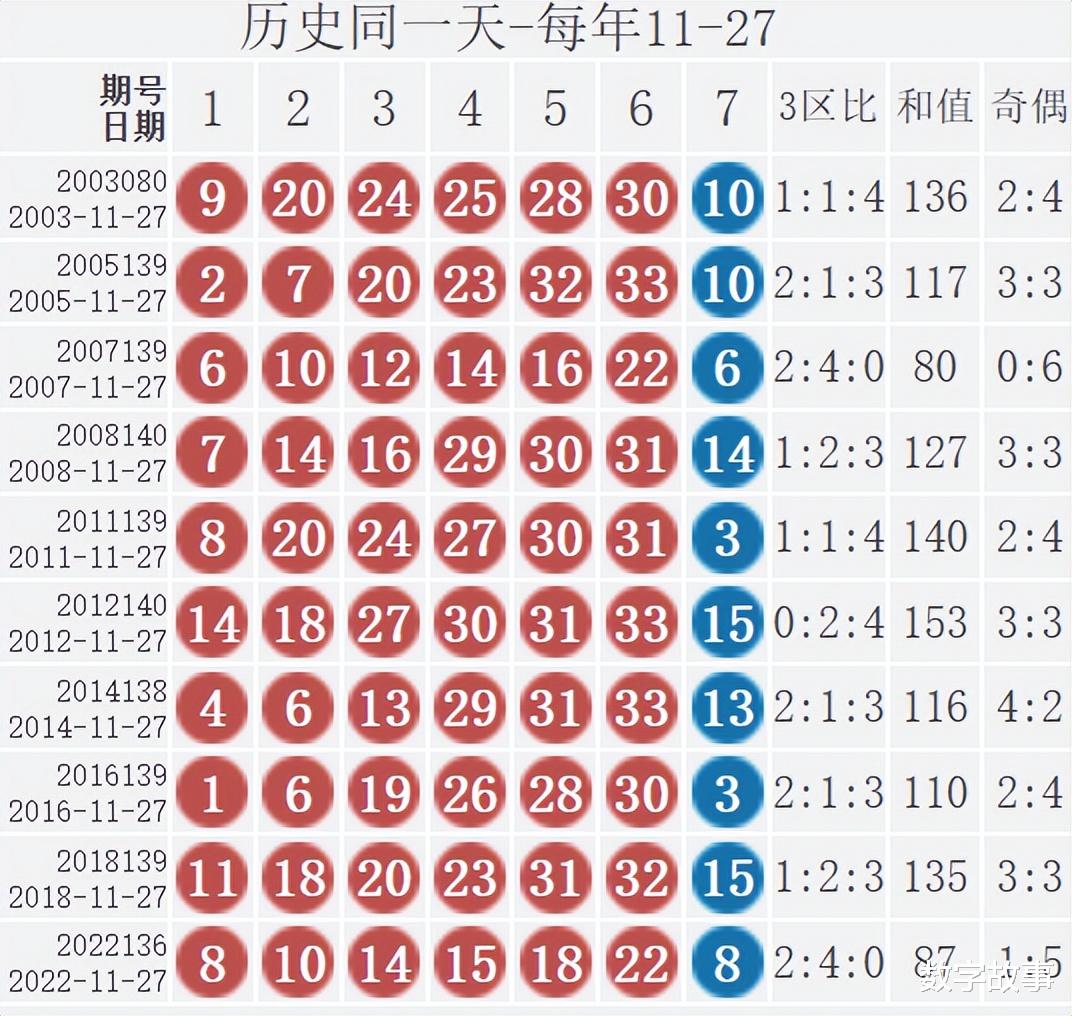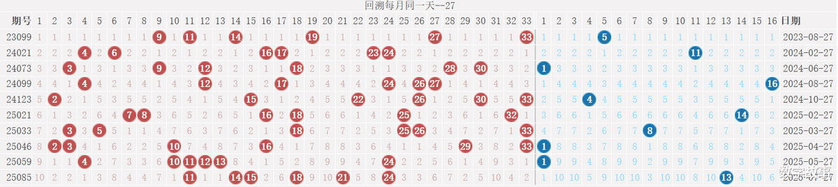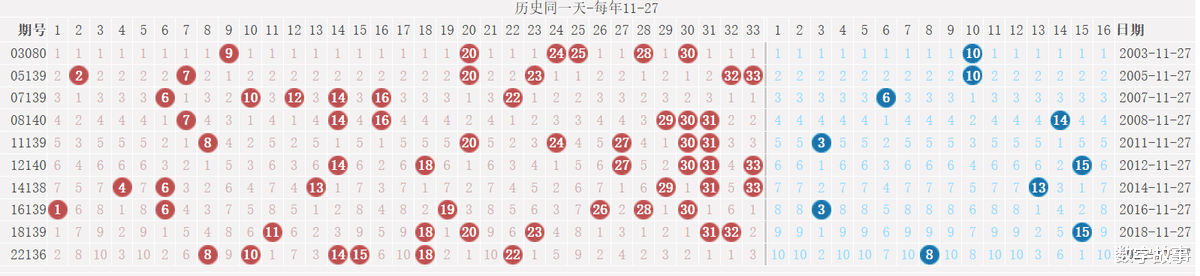 博弈心理,挑战概率: 看近期开奖号码,也可看历史数据统计!【双色球25137期多角度冷热号】双色球25137期四维走势图,红蓝号统计及冷热号1) 历史同一天: 11月27日 (共10期)