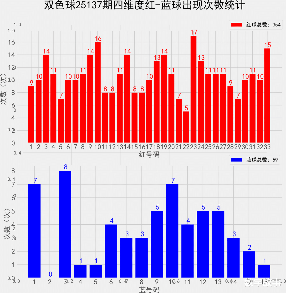 => 统计出现概率综合以上4个纬度的号码, 共59期根据出现的次数,分为热号,冷号,其他的为温号。统计样本数据:354个红球 59个蓝球