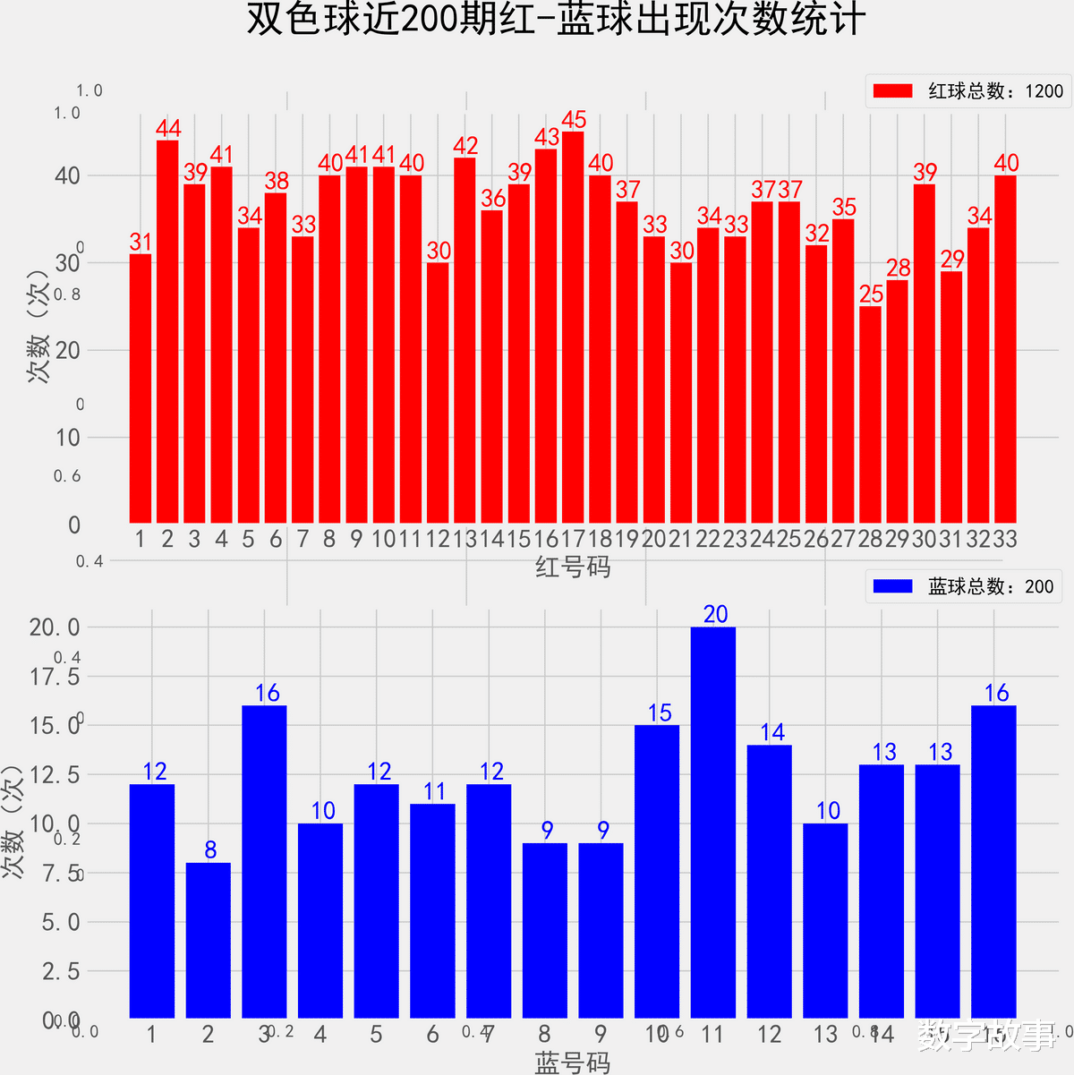 双色球近200期红蓝号统计情况统计样本数据: 1200个红球 200个蓝球