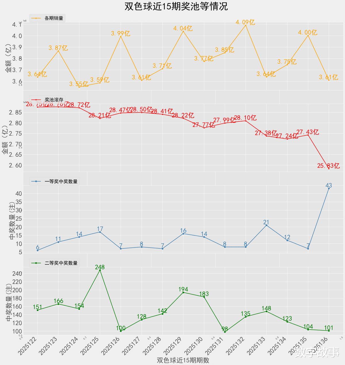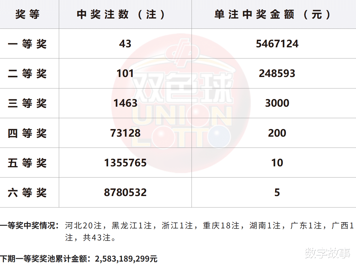 双色球25136期一等奖: 43注二等奖: 101注本期全国销售金额:361034006 元 奖池滚存:2583189299 元.近15期奖池滚存, 中奖情况等信息: