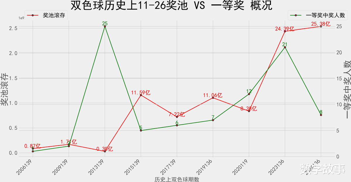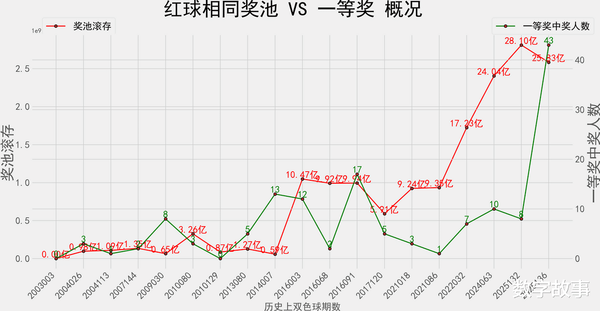 文末有双色球红球等差数14-23-32, 及8-10-28的历史统计。【福彩双色球25136期开奖结果及统计】红球号组合历史上有1期四球相同,蓝球12,43注一等奖,奖池25.83亿(2583189299)。