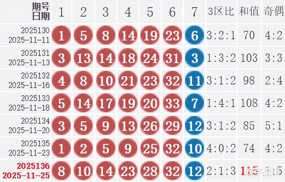 双色球25136期开奖结果及中奖情况:出奖时间: 2025-11-25 星期二 红球: 8-10-14-23-28-32蓝球: 12双色球红球重号叠码:32蓝球隔期下落:12红球奇偶比:1:5红球和值:115红球跨度:24 三区比:2:1:3没有连号
