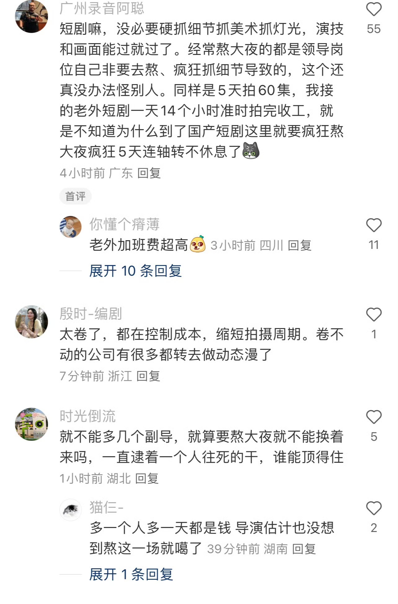 事件的起因直指短剧行业的“速度陷阱”。为压缩成本,剧组常将原本数月的拍摄任务压缩至7天内完成100集,工作人员日均工作超20小时,连续一周无法回酒店休息成为常态。跟焦员需扛几十斤设备连轴转,化妆师因连续工作20小时猝死,副导演累至胃出血——这些案例揭露了光鲜剧本背后的血汗真相。更讽刺的是,这种极限工作模式竟被包装为“敬业精神”,拒绝加班者反被贴上“不专业”标签。