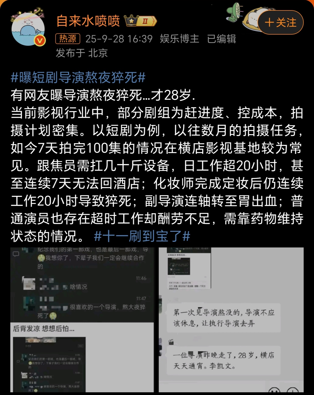 2025年9月,一则“28岁短剧导演熬夜猝死”的消息引爆网络。据知情人士透露,这位年轻导演在横店影视基地连续通宵工作后倒下,现场人员的朋友圈截图和同行悼念(如“导,我想你了,下辈子继续合作”)证实了悲剧的发生。演员戴娇倩随后在社交平台发声,呼吁行业关注工作人员的健康状况,称“很多剧组人员一天只睡三四个小时,命比工作重要”。