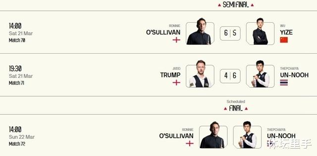 最终的争冠之战:奥沙利文对阵塔猜亚,采取19局10胜制,分为两个阶段进行,第一阶段打满九局,第二阶段决出冠军,分别会在北京时间3月22日14点、19点30分打响。