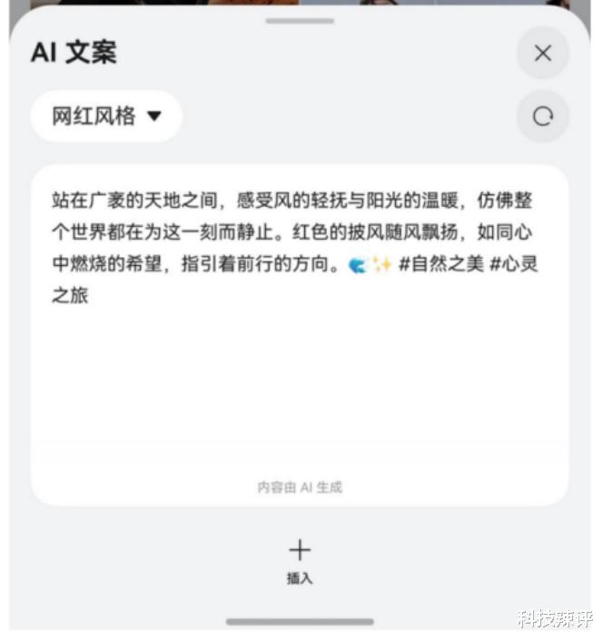 而真正让我惊喜的是“AI文案”功能。点开后,屏幕上跳出一段文字:“站在广袤的天地之间,感受风的轻抚与阳光的温暖……”这句话像一个记忆“扳机”,瞬间将我拉回当时的情境,那些几乎被遗忘的、关于风的触感和阳光的温度的细节,一下子全涌了回来。