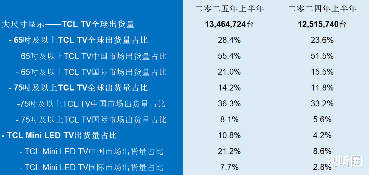 在欧洲市场,75英寸及以上TCL TV出货量同比提升71.7%,Mini LED TV出货量同比大幅增长91.0%;在北美市场,尽管面临美国关税战带来的市场混乱,在整体需求低迷、总销量下滑的背景下,依然逆势实现75英寸及以上TCL TV出货量同比增长43.8%,Mini LED TV出货量同比激增349.6%;在包括亚太、拉美、中东和非洲在内的新兴市场,75英寸及以上TCL TV出货量同比增长68.4%......