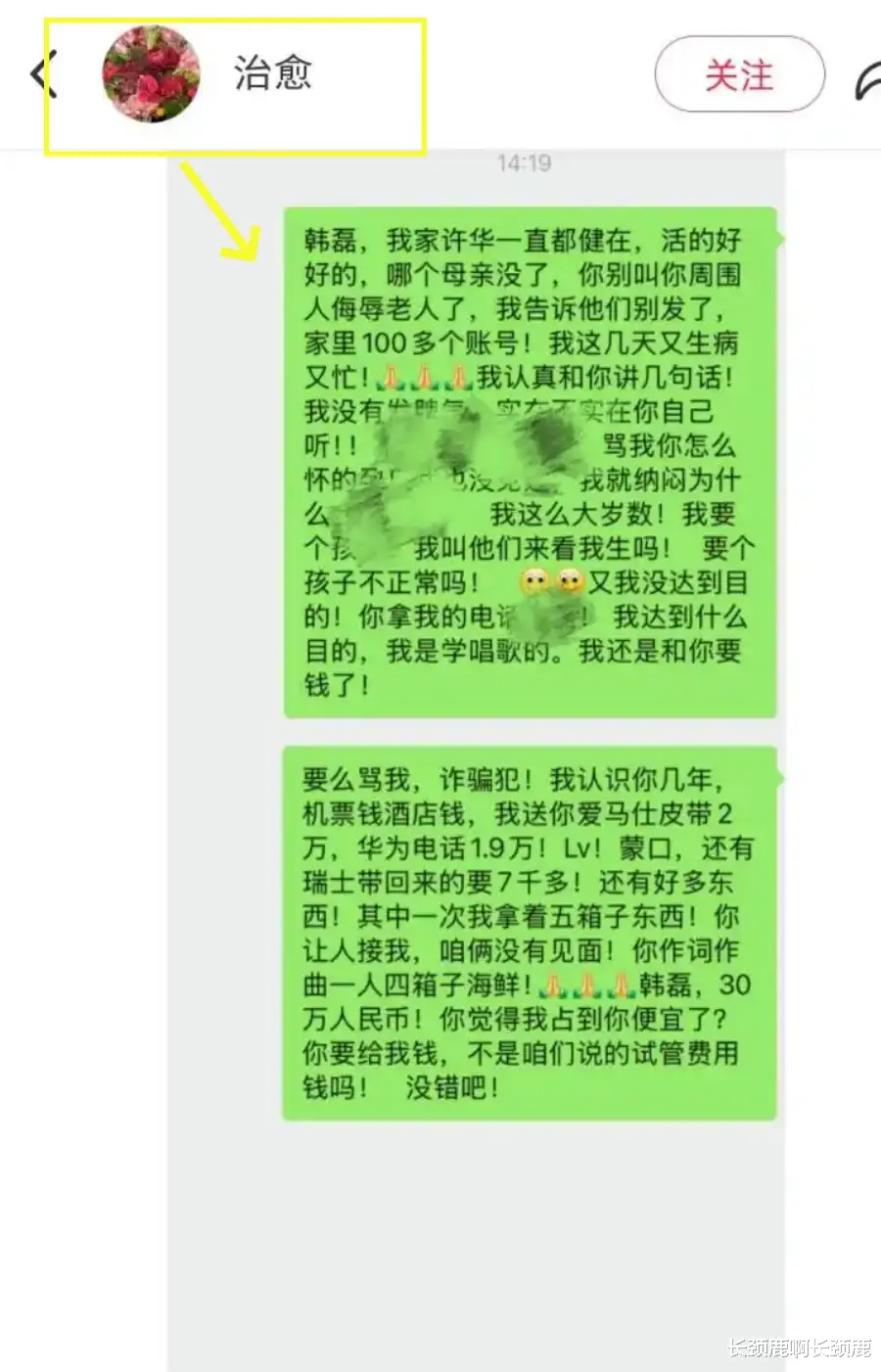 只不过后来韩磊翻脸,不但不承认,还公然痛骂她妈妈和家人。