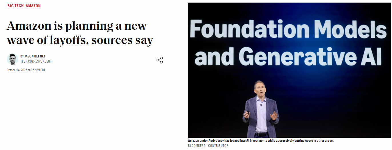 在2022年至2023年之间,亚马逊首席执行官安迪・贾西(Andy Jassy)曾主导进行了亚马逊历史上最大规模的裁员,至少裁撤了2万7千个岗位。安迪・贾西曾在全员邮件中表示,“这辆巴士(亚马逊)上不会容纳所有人,我们预计,随着公司内广泛使用AI人工智能,效率将得到提高,这将减少公司的总员工人数。”