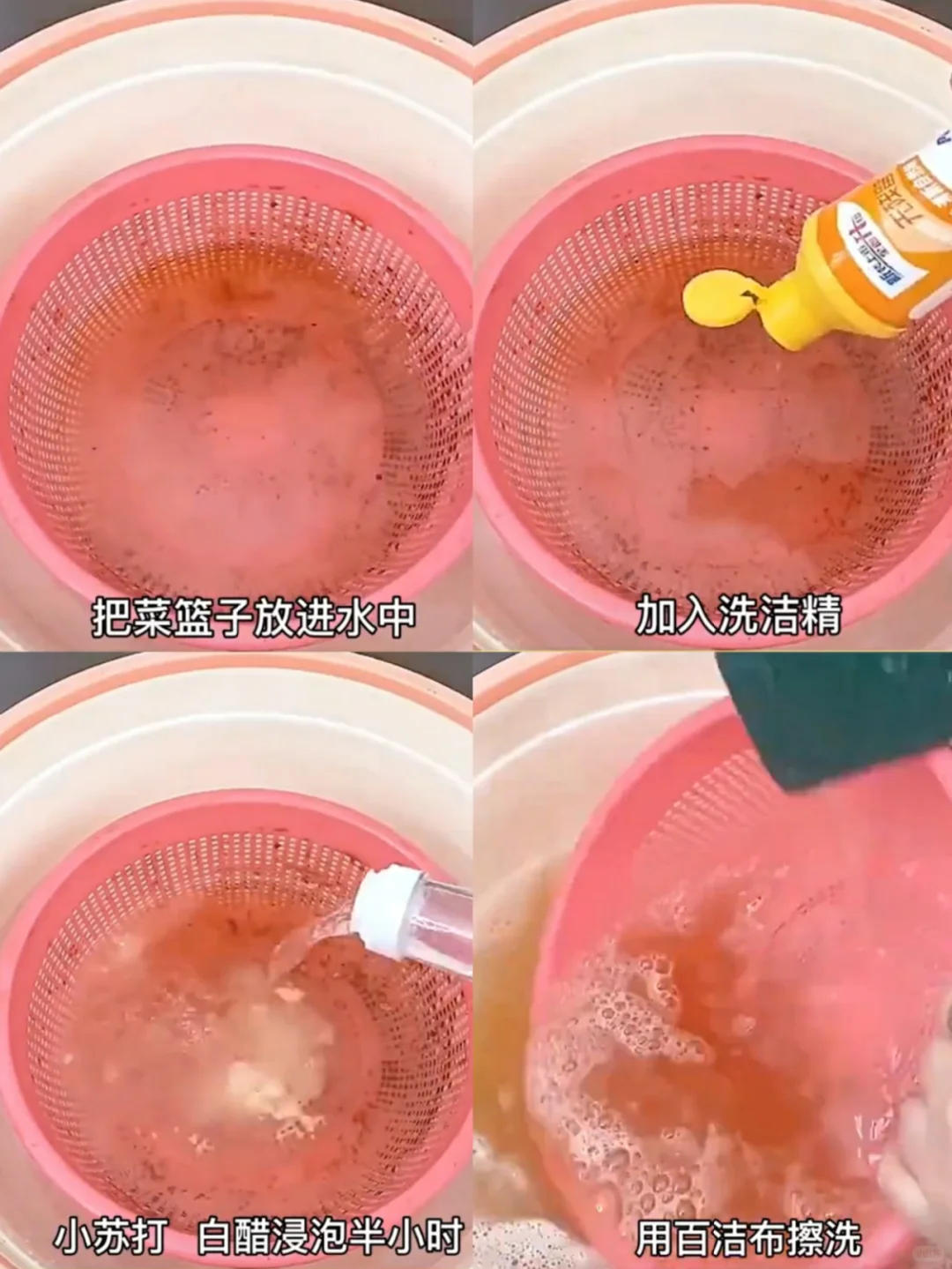 这个时候大家只需要将洗菜篮放入水中,然后加入一点洗洁精,小苏打和白醋浸泡半个小时左右,再使用百洁布擦拭一下就能够变得干干净净了。